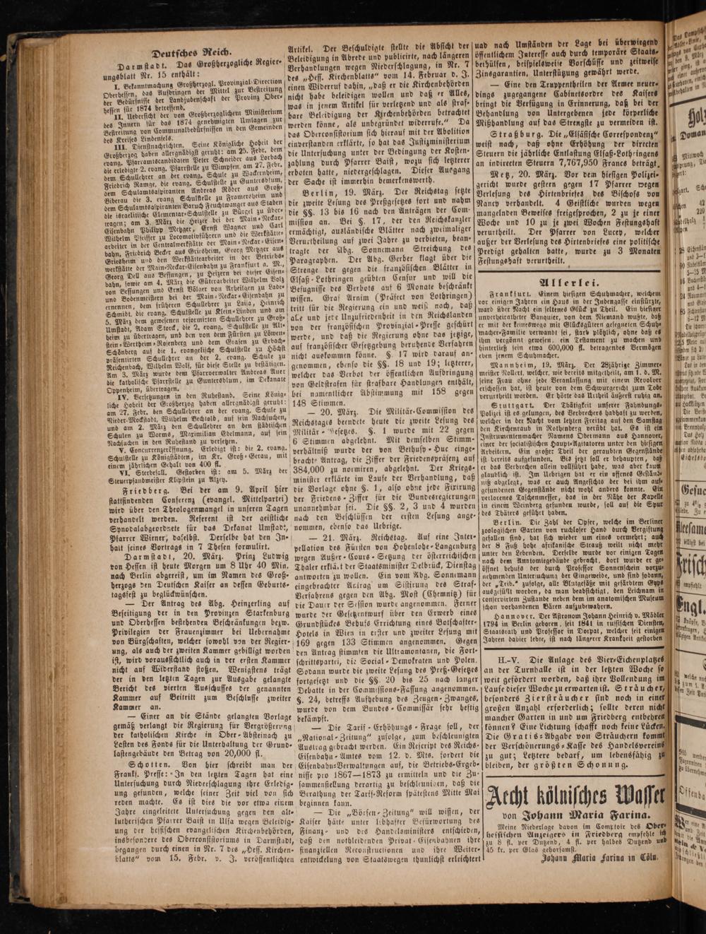 — 21. März. Reichstag. Auf eine Inter- pellation des Fürsten von Hohenlohe-Langenburg wegen Außer Cours Setzung der österreichischen Thaler erklält der Staatsminister Delbrück, Dienstag antworten zu wollen. Ein vom Abg. Sonnemann eingebrachter Axtrag um Sistirung des Straf- Verfahrens gegen den Abg. Most(Chemnitz) für vie Dauer der Session wurde angenommen. Ferner wurde der Gesetzentwurf über den Erwerb eines Grundstückes Bebufs Errichtung eines Botschafter— Hotels in Wien in erster und zweiter Lesung mit 169 gegen 133 Stimmen angenommen. Gegen den Antrag stimmten die Ultramontanen, die Fort- schrittspartei, die Social- Demokraten und Polen. Sodann wurde die zweite Lesung des Preß'Gesetzes fortgesetzt und die§§. 20 bis 25 nach langer Debatte in der Commissions-Fassung angenommen. §. 24, betreffs Aufhebung des Zeugen-Zwanges, wurde von dem Bundes- Commissär sehr heftig bekämpft.