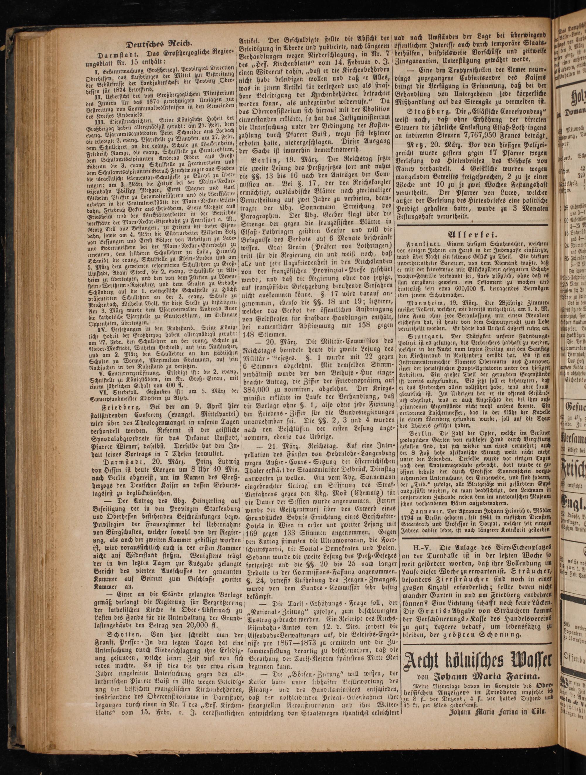 Deutsches Reich. Darmstad t. Das Großherzogliche Regier ungsblatt Nr. 15 enthält: 88 I. Bekanntmachung Großherzogl. Provinzial: Direction Oberhessen, das Aufbringen der Mittel zur Bestreitung der Bedürfnisse der* der Provinz Ober⸗ en für 1874 betreffend. 1 besszr sedersicht der von Großherzoglichem Ministerium des Innern für das 1874 genehmigten Umlagen zur Beflreitung von Communalbedürfnissen in den Gemeinden reises Lindenfels. 0 n Seine Königliche Hoheit der Großberzog haben allergnädigst geruht: am 25. Febr. 117 7 evang. Pfarramtscandidaten Peter Schneider aus Lorbach die erledigte 2. evang. Pfarrstelle zu Wimpfen, am 27. Febr. dem Schullehrer an der evang. Schule zu Wackernheim, Friedrich Ramge, die evang. Schulstelle zu Guntersblum, dem Schulamtsaspiranten Andreas Röder aus Groß Biberau die 3. evang Schulstelle zu Framersheim und dem Schulamtsaspiranten Baruch Feuchtwanger aus Staden die israelitische Elementar⸗Schulstelle zu Bürgel zu über⸗ tagen; am 3. März die Heizer bei der Main ⸗Neckar Eisenbahn Philipp Metzger, Ernst Wagner und Carl Wilbelm Pfeiffer zu Locomotivführern und die Werkstätle⸗ arbeiter in der Centralwerkstätte der Main⸗Neckar⸗Eisen⸗ bahn, Friedrich Becker aus Griesheim, Georg Metzger aus Griesheim und den Werkstättearbeiter in der Betriebs⸗ werkstätte der Main⸗Neckar⸗Eisenbahn zu Frankfurt a. M., Georg Dell aus Bessungen, zu Heizern bei dieser Eisen⸗ bahn, sowie am 4. März die Güterarbeiter Wilhelm Volz von Bessungen und Ernst Völger von Arbeilgen zu Lade⸗ und Bodenmeistern dei der Main⸗Neckar⸗Eisenbahn zu ernennen, dem früheren Schullebrer zu Laisa, Heinrich Schmidt, die evang. Schulstelle zu Klein⸗Linden und am 5. März dem gewesenen reformirten Schullehrer zu Groß⸗ Umstadt, Adam Storck, die 2. evang. Schulstelle zu Alt⸗ heim zu übertragen, und den von dem Fürsten zu Löwen⸗ flein⸗Wertheim⸗Rosenberg und dem Grasen zu Erbach Schönberg auf die 1. evangelische Schulstelle zu Höchst präsentirten Schullehrer an der 2. evang. Schule zu Reichenbach, Wilhelm Wolf, für diese Stelle zu bestätigen. Am 3. März wurde dem Pfarrverwalter Andreas Auer die katbolische Pfarrstelle zu Guntersblum, im Dekanate Oppenheim, übertragen. a IV. Versetzungen in den Ruhestand. Seine König⸗ liche Hobeit der Großherzog haben allergnädigst gerubt; am 27. Febr. den Schullehrer an der evang. Schule zu Rieder⸗Mockstadt, Wilhelm Bechtold, auf sein Nachsuchen, und am 2. März den Schullebrer an den städtischen Schulen zu Worms, Maximilian Edelmann, auf sein Nachsuchen in den Ruhestand zu versetzen. V. Concurrenzerkffnung. Erledigt ist: die 2. evang. Schulstelle zu Königstädten, im Kr. Groß⸗ Gerau, mit einem jährlichen Gehalt von 400 fl. VI. Sterbefall. Gestorben ist: Steuerpfandmeister Klipstein zu Alzey.