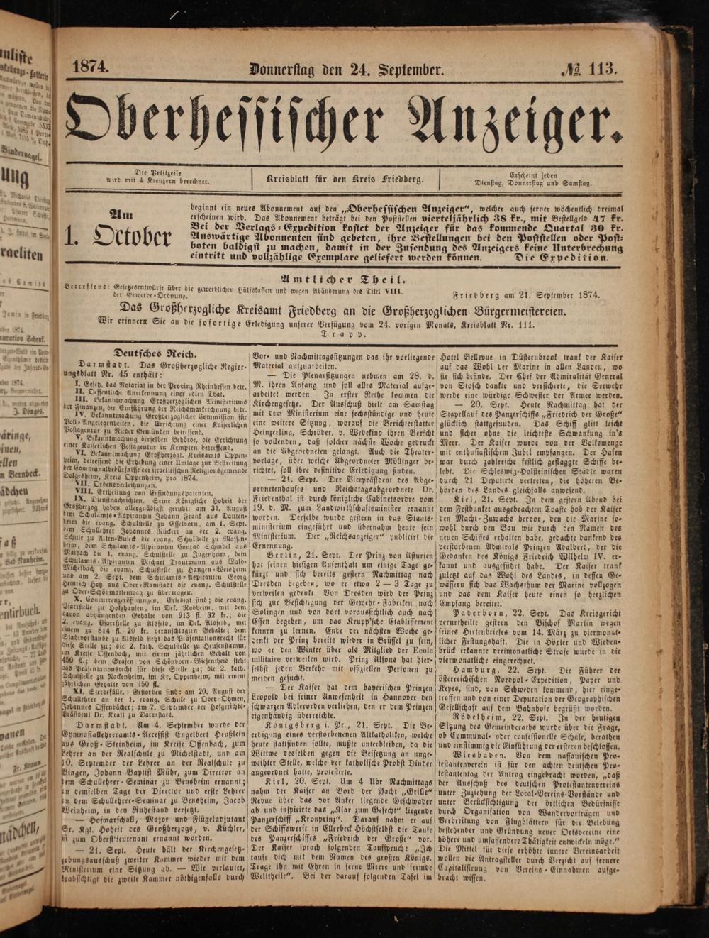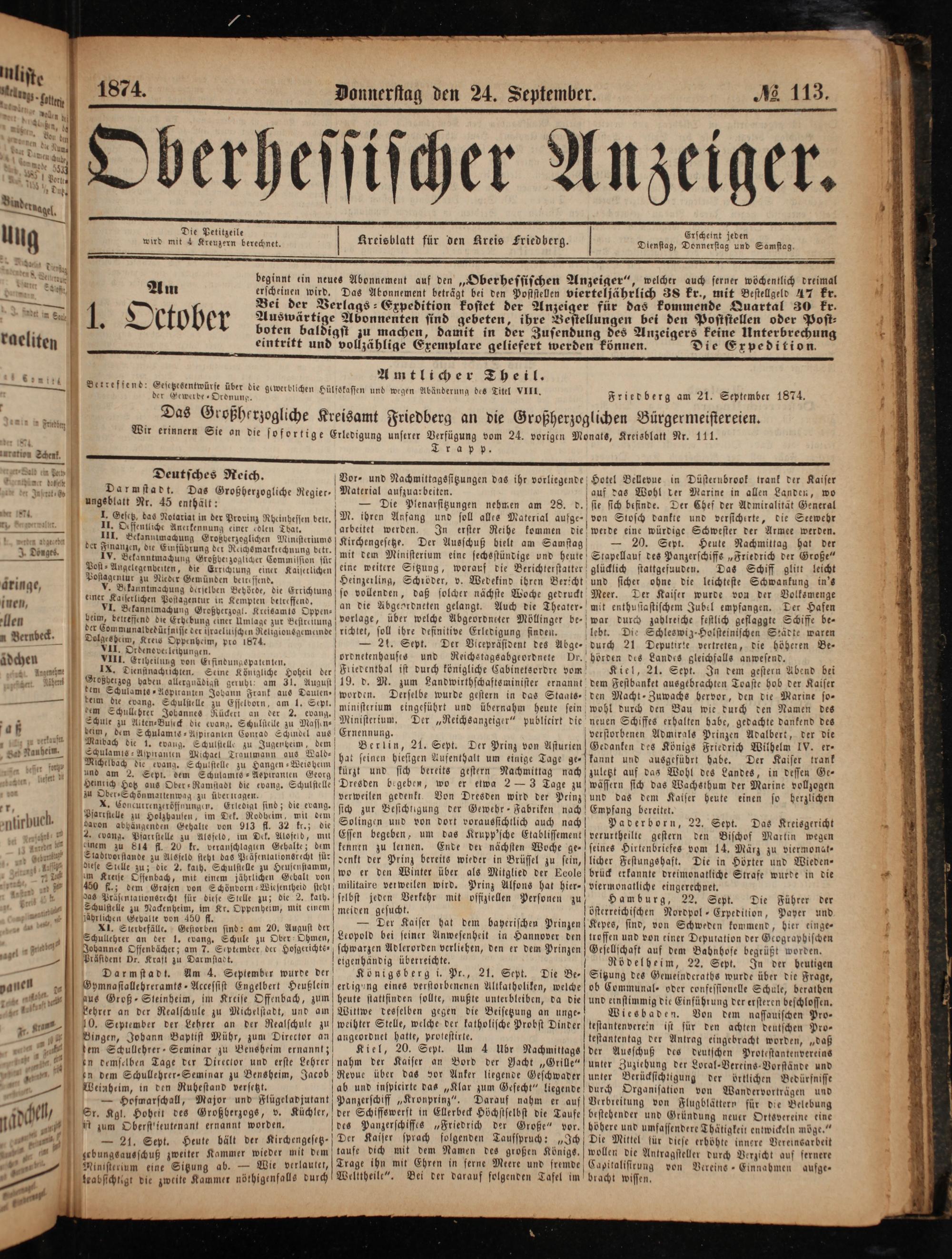 beginnt ein neues Abonnement auf den„Oberhessischen Anzeiger“, welcher auch serner wöchentlich dreimal erscheinen wird. Das Abonnement beträgt bei den Poststellen vierteljährlich Zs kr., mit Bestellgeld 47 kr. Bei der Verlags Expedition kostet der Anzeiger für das kommende Quartal 30 kr. Auswärtige Abonnenten sind gebeten, ihre Bestellungen bei den Poststellen oder Post⸗ boten baldigst zu machen, damit in der Zusendung des Anzeigers keine Unterbrechung eintritt und vollzählige Exemplare gelie