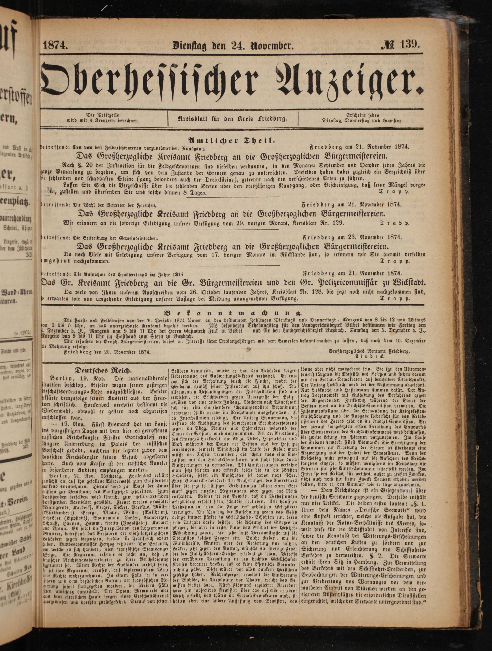 e Mahnung erfolgt. Friedberg den 20. November 1874.
