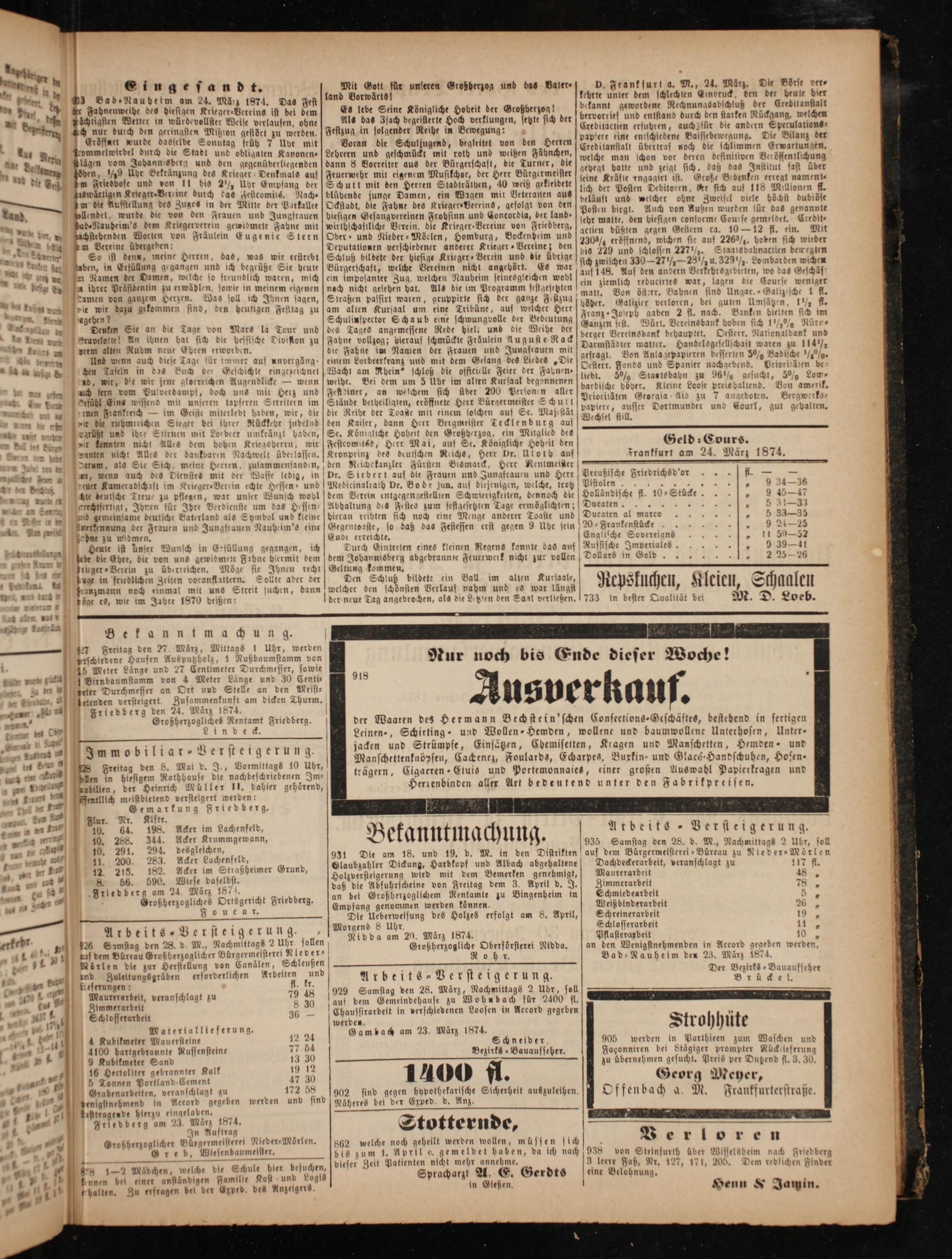 abilien, der Heinrich Müller II. dahier gehoͤrend, Herrenbinden aller Art bedeutend unter den Fabrikpreisen. entllich meistbietend versteigert werden: N Gemarkung Friedberg. Ar. N. 1 4 Ack Lachenfel F ip N* 11 6„Bert l N 10. 64. 198. Acker im Lachenfeld, NN erteigeran g. 10. 288. 344. Acker Krummgewann, Bekanntmachung. 3 Samst 28. d. M., N l 2 f 5 10. 291. 294. desgleichen, f g 5 nn Nachmittags 2 Ubr, soll 11. 200. 283 Acker Lachenfeld, 931 Die am 18. und 19. d. M. in den Distrikten auf dem Bürgermeisterei-Büreau zu Nieder-Mörlen 12. 205. 182. Acker im Straßheimer Grund, Olaubzabler Dickung, Harbkopf und Albach abgehaltene Dachdeckerarbeit, veranschlagt zu 117 fl. 4 1 8 1 Wiese daselbst. Holzverstelgerung wird mit dem Bemerken genehmigt, Maurerarbeit 18 5 1. 7 90. A Nan 1874 daß die Abfuhrscheine von Freitag dem 3. April d. 2. Zimmerarbeit. 78„ 1 0 Friedberg am. 8 tsgericht Frledber an bei Großherzoglichem Rentamte zu Bingenheim in Schmiedearbeit 3 0 Großherzogliches Aa 8. Empfang genommen werden konnen. Weiß binderarbeit 3 AAA. Die Ueberweisung des Holzes erfolgt am 8. April, Schreinerarbeit 3 1 Reer a* Morgens 8 Uhr. Schlosserarbeit 8 tebr n* 3* 47* 52 solenn Nidda am 20. Mur lat 1 et ee 10. 4„„ 126 Samstag den 28. d. M., Nachmittags 2 Uhr, 14 Großherzogliche Oberforsterei Nidda. an den Wenigstnehmenden in Accord gegeben werden. 1 deaf dem Büreau Großherzoglicher Bürgermeisterel Nleder⸗ R o h r Bad- Nanbelm den 23. März 1874. er Nörlen dle zur Herstellung von Canälen, Schleußen..* n 8—— erforderlichen Arbeiten 8 Arbeits-Versteigerung. r 2 e a ö* 79 48 929 Samstag den 28. Marz, Nachmittags 2 Uhr, soll e 30 aas den Gem dehae ue bebach sür 20%. 2 1 Schlosserarbeit 36— Chaussirarbeit in verschiedenen Loosen in Accord gegeben 5 e a werden. Strohhüte 1 Matertallieferung. 3 Gambach am 23. März 1874. f A 4 Kubikmeter Mauersteine 12 24 Schneider, 905 werden in Parthieen zum Waschen und e 4100 hartgebrannte Nussensteine 77 54 Bezirks ⸗Bauaufseher. Fagonniren bei Staͤgiger prompter Nuückteferung „ a t. 9 Kubikmeter Sand— 1 5 zu übernehmen gesucht. Preis per Dutzend fl. 3. 30. 1 7 16 Hectoliter gebrannter Kal 12 1400 fl 1 r 50 en** 5. Portland Cement 47 30* 5 Georg M cher, —* Grabenarbeiten, veranschlagt zu 172 68 902 sind gegen hypothekarische Sicherheit auszuleihen. Offen bach a, M. Frankfurterstraße. 7 NI in— gegeben werden und sind Näheres bei der Exped. d. Anz. * 2* + isttragende lerzu einge aben. 1 e eeeeeeeeeeeeneeeeeeeee.² - n be Stotternde,— cen 3 1 27 OGroßherzogllicher Bürgermeisterei Nieder⸗Mörlen. 862 welche noch geheilt werden wollen, müssen sich g Ser U ern 1. 1 Gre b, Wlesenbaumelste nr. bis zum 1. April le. gemeldet haben, da ich nach 938 von Steinfurth über Wisselsteim nach Friedberg * 7 570 14 Mädchen welche bie Schule hler besuchen,] dleser Zeit Patienten nicht mehr annehme.. 9 leere Faß, Nr. 127, 171, 205. Dem redlichen Finder 7* 5„. nnen bei einer anständigen Familte Kost und Logls Spracharzt A. E. Gerdts eine Belohnung. 1 1 * 11„ balten. Zu erfragen bel der Exped. des Anzeigers. in Gießen. Henn& Jamin. * U ö 1* *