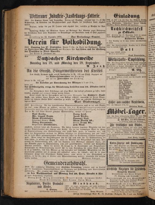 2878 Die nochmalige Abhaltung einer öffentlichen Versannnlung erscheint uns im Hinblick auf die bevorstehende Gemeinderathswahl zur Berathung und Feststellung einer Candidatenliste nothwendig. Wir erlauben uns daher, unsere Mitbürger in den Nathhaussaal auf Montag den 28. Sept. Abends 8 Uhr zu einer Besprechung einzuladen. Georg Falck. Georg Hieronimus. Adam Stein häußer.