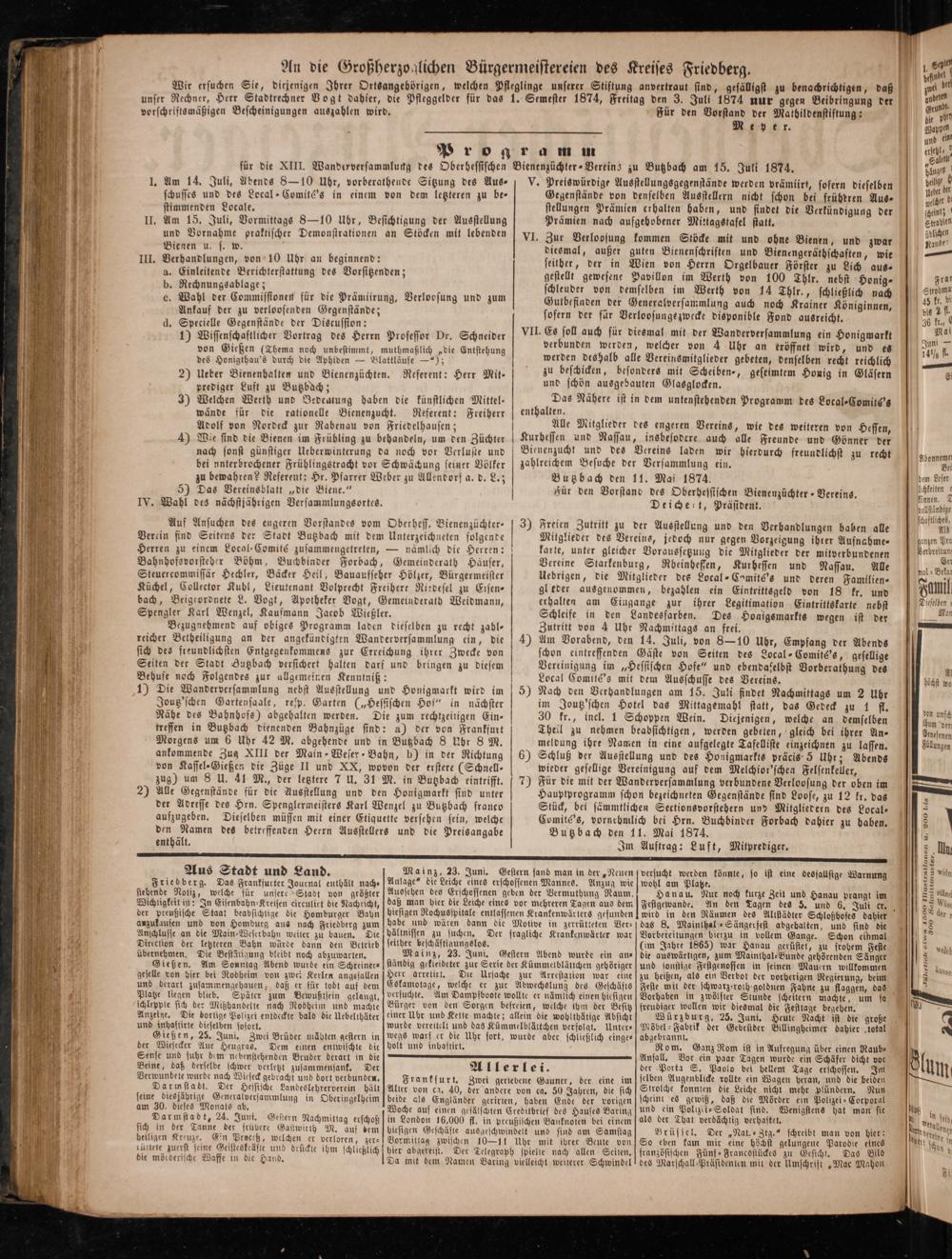 Butzbach den 11. Mai 1874. Für den Vorstand des Oberhessischen Bienenzüchter Vereins. Deichert, Präsident.