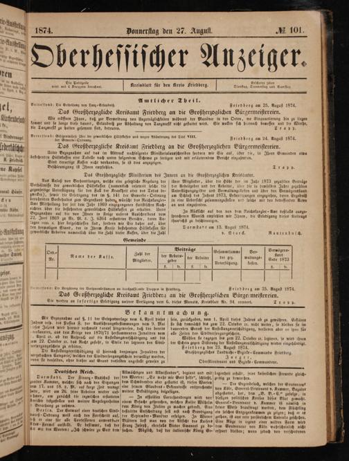 Friedberg am 24. August 1874. an die Großherzoglichen Bürgermeistereien.
