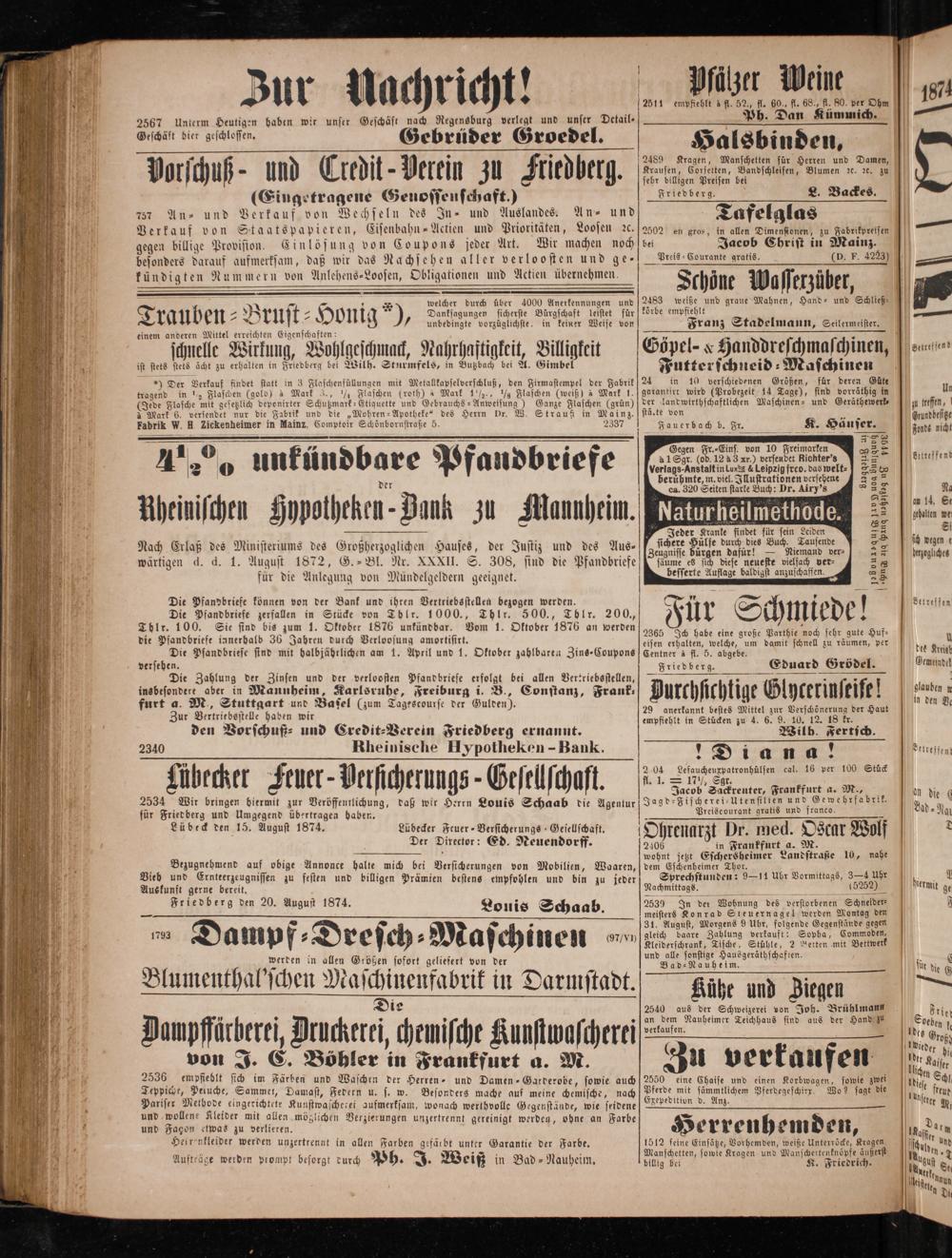 2534 Wir bringen biermit zur Veröffentlichung, daß wir Herrn Louis Schaab die Agentur für Friedberg und Umgegend übertragen haben. Lübeck den 15. August 1874.