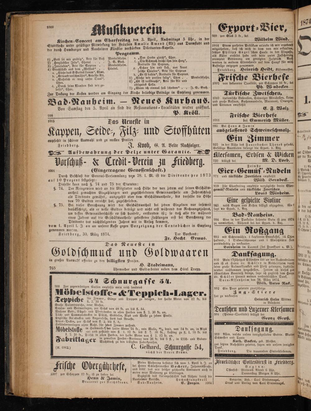 zu vermiethen. Näheres bei der Exped. d. Anz. fl. II kr. fl. 34 kr. 2 f. Ein Roß gang 993 mit Schrotmühle. 1 kupferner Braukessel, 14 Ohm haltend, 1 Dickmaischpumpe und 1 Maischbütte sind preiswürdig zu verkaufen. Bornheim im Taunus(bei Frankfurt a. M.). sbrtressent * 0 Na. Danksagung. 58s ir i 990 Mein(Jähriges Söhnchen litt an der Rachenbräune skiobachtet u und ist es Herrn br. Schäfer in Reichelsheim durch n Schwe seine große Aufmerksamkeit und Fleiß gelungen, dasselbe* wieder vollkommen herzustellen. Indem ich dieses zur. Unt öffentlichen Kenntniß bringe, sage ich zugleich dem Herrn r Vorsscgl Dr. Schäfer hiermit meinen verbindlichsten Dank. de Bestimm: Dorn-Assenheim den 26. März 1874. auf 1 a e Wilh. Anton Rack. Mig 992 Ein Paar gelernte zweijährige 1 5 N Zug ⸗ Stiere It hat zu verkaufen 8 0 Heinrich Hahn Wittwe 9 2 in Bönstadt. Albisondere N Deutschen und Luzerner Kleesamen (Prima⸗Qualität) billigst bei a 5 Georg Groß. eee eee Dauk tales, anksagung. dennen, 999 Allen, welche unsere innigstgeliebte Gattin, Muttet ume Hessen Schwester und Tante 4 Arlt anbe Kath. Backes, geb. Meister, 1 zur letzten Ruhestaͤtte geleitet, sagen wir unsern innigsten Dank. Friedberg. Die trauernden Hinterbliebenen. ..... ̃. ————————8' Istaclitischer Gottesdienst in Friedberg. Bengt! Osterfest: Mittwoch Abend 6 Uhr. 15 Donnerstag Morgen 8 Uhr. Verantw. Red.: Carl Bindernagel. 9 Na noch Druck und Verlag von Carl Bindernagel. eie. 1 11