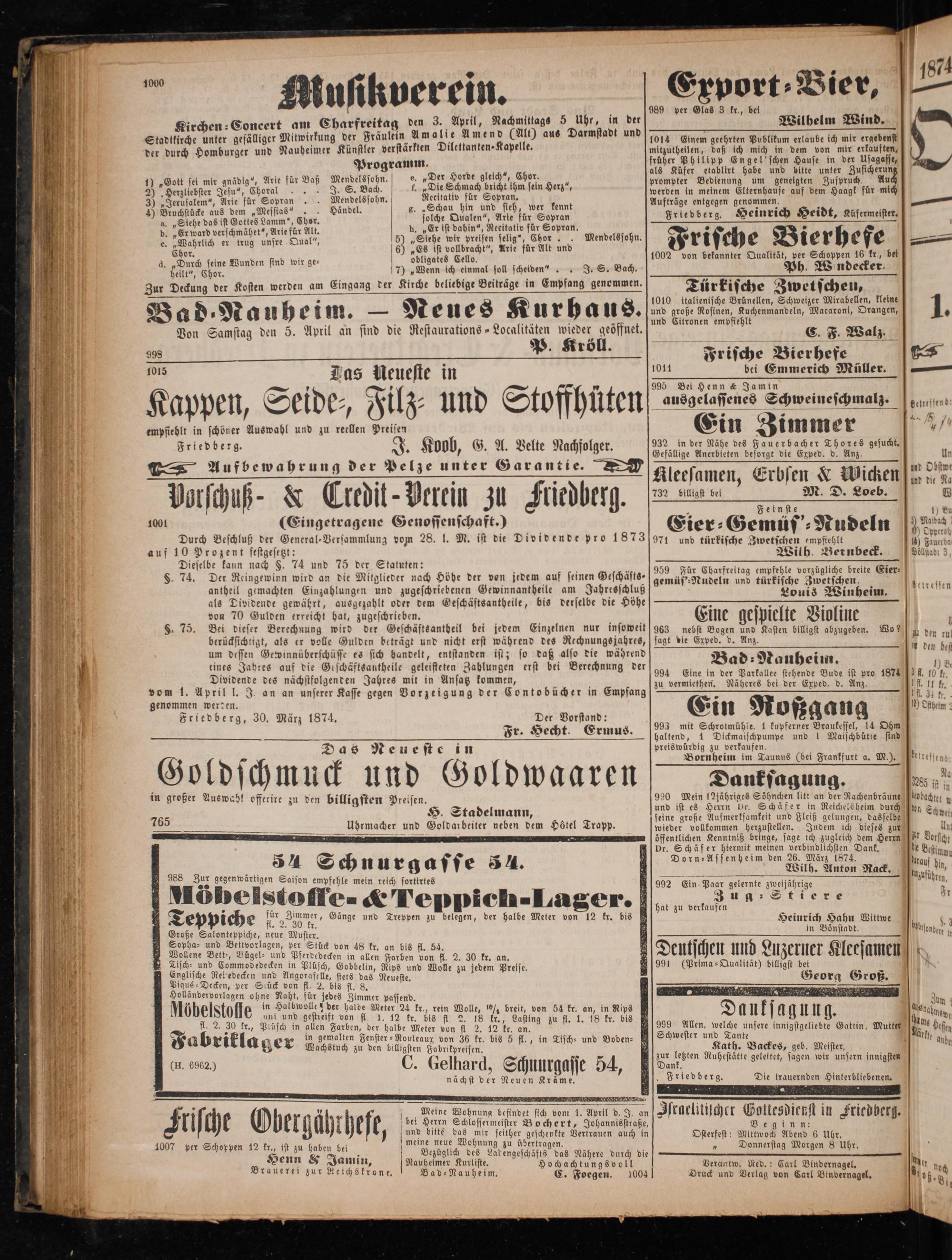 berücksichtigt, als er volle Gulden beträgt und nicht erst während des Rechnungsjahres, um dessen Gewinnüberschüsse es sich handelt, entstanden ist; so daß also die während tines Jahres auf die Geschäftsantheile geleisteten Zahlungen erst bei Berechnung der Dividende des nächstfolgenden Jahres mit in Ansatz kommen, vom 1. April l. J. an an unserer Kasse gegen Vorzeigung der Contobücher in Empfang genommen werden. Friedberg, 30. März 1874. Der Vorstand: Fr. Hecht. Ermus.