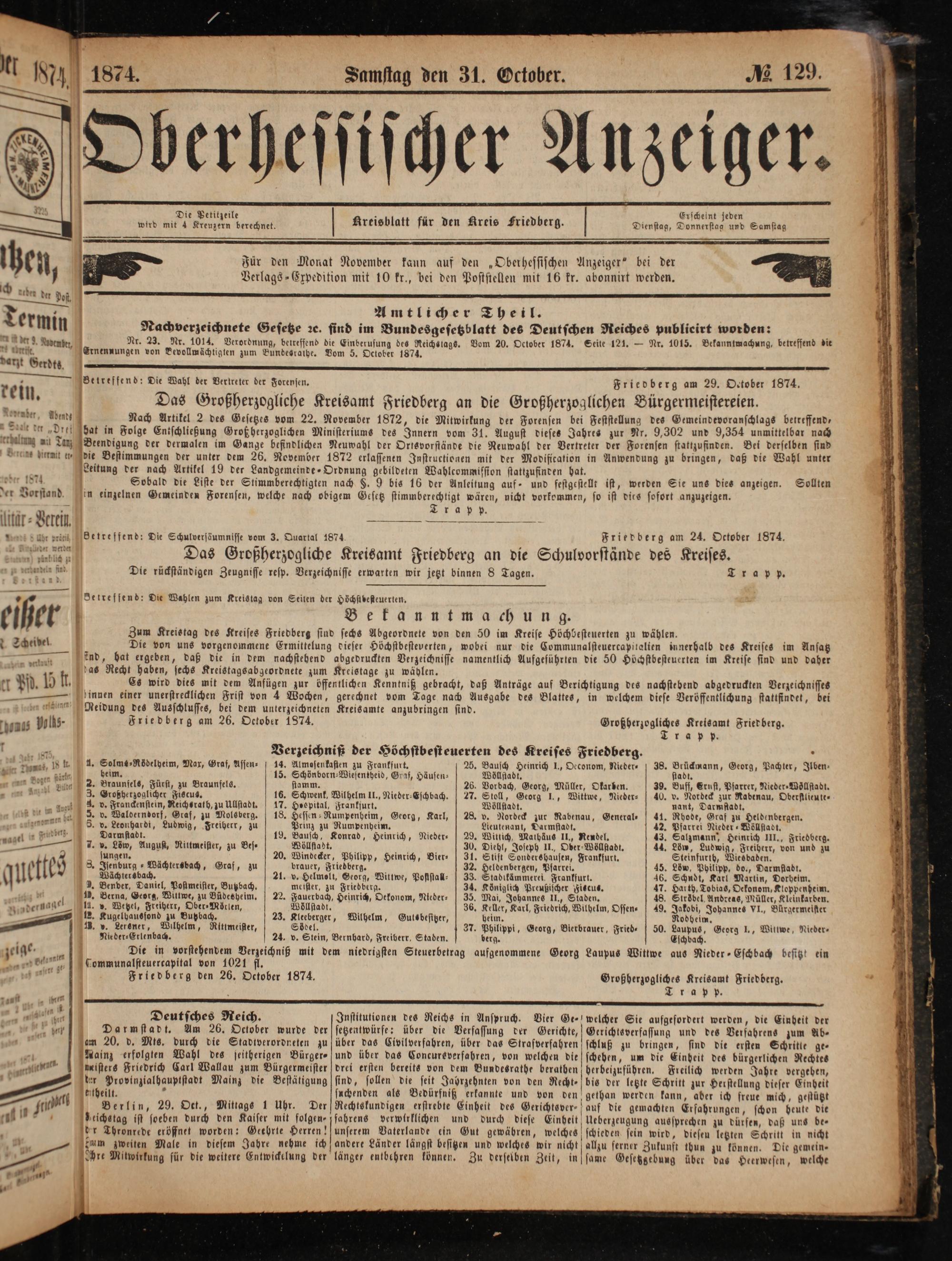 Es wird dies mit dem Anfügen zur öffentlichen Kenntniß gebracht, daß Anträge auf Berichtigung des nachstebend abgedruckten Verzeichnisses innen einer unerstrecklichen Frist von 4 Wochen, gerechnet vom Tage nach Ausgabe des Blattes, in welchem diese Veröffentlichung stattfindet, bei Meidung des Ausschlusses, bei dem unterzeichneten Kreis amte anzubringen sind. Friedberg am 26. October 1874.