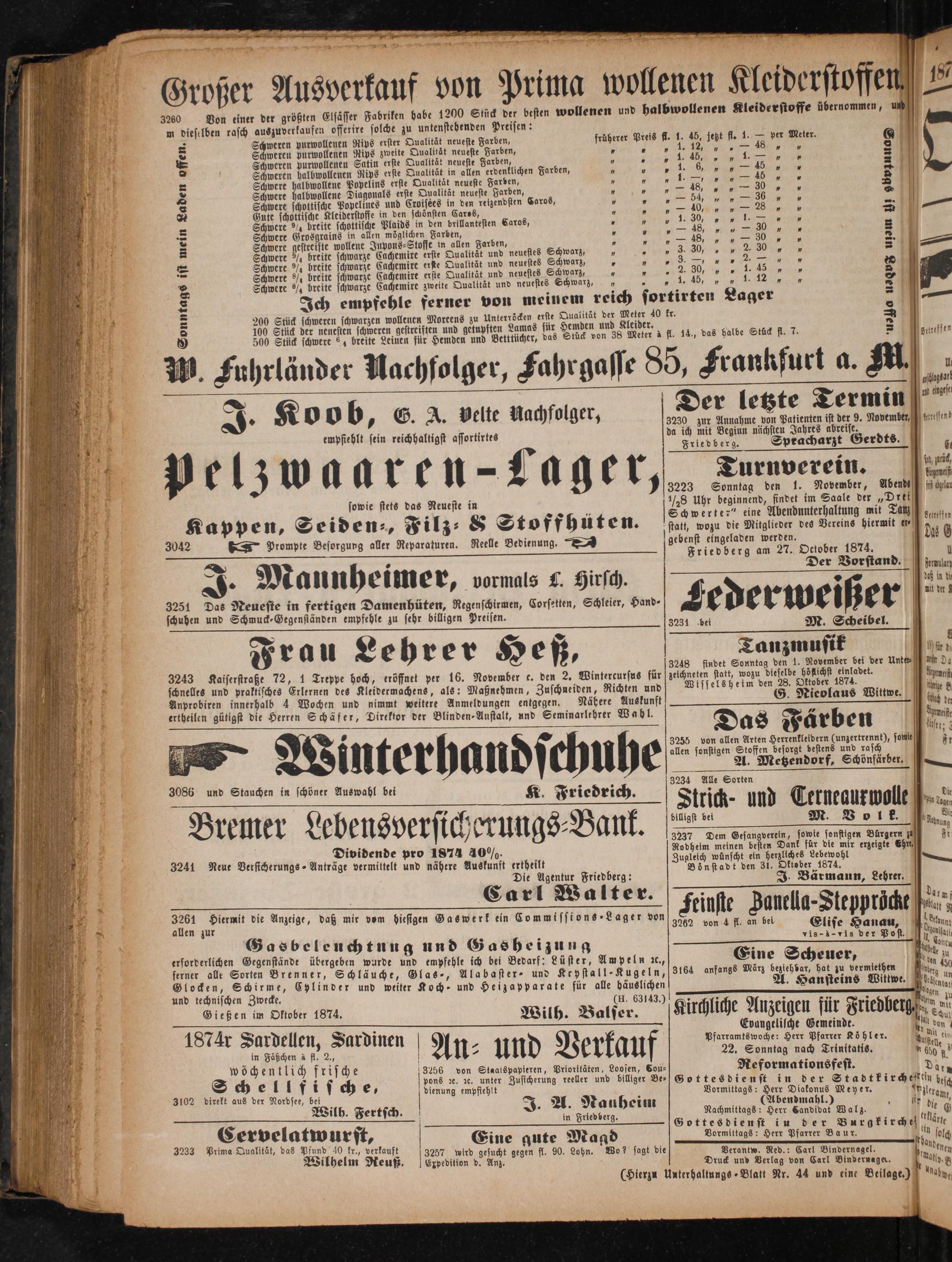 Friedberg. 7 Turnverein. 22 3223 Sonntag den 1. November, Abende fi e ½8 Uhr beginnend, findet im Saale der„Drei Schwerter“ eine Abendunterhaltung mit Tanz gn statt, wozu die Mitglieder des Vereins hiermit en⸗ 5 gebenst eingeladen werden. 18 0 Friedberg am 27. October 1874. U Der Vorstand. damen * Tun u Lederweißer 3231 bei M. Scheibel. 7 1 Tanzmusik hn n 3248 findet Sonntag den 1. November bei der Unte⸗ in Da zeichneten statt, wozu dieselbe hö flichst einladet. ügnnn Wisselsheim den 28. Ottober 1874. 1 dhe G. Nicolaus Wittwe. h, Das Färben 3255 von allen Arten Herrenkleldern(unzertrennt), sowꝛse 1 allen sonstigen Stoffen besorgt bestens und ra sch 8 A. Metzendorf, Schönfärber. 3234 Alle Sorten N 8 5 n— Strick- und Cerneaur wolle billigst bei M. V o 1 k. Mh 3237 Dem Gesangvereln, sowie sonstigen Bürgern öt Rodheim meinen besten das 15 erzeigte Ehr, lei ünscht ei es Lebewo— e Table den 3. Diebe 487 J. Bärmann, Lehrer.