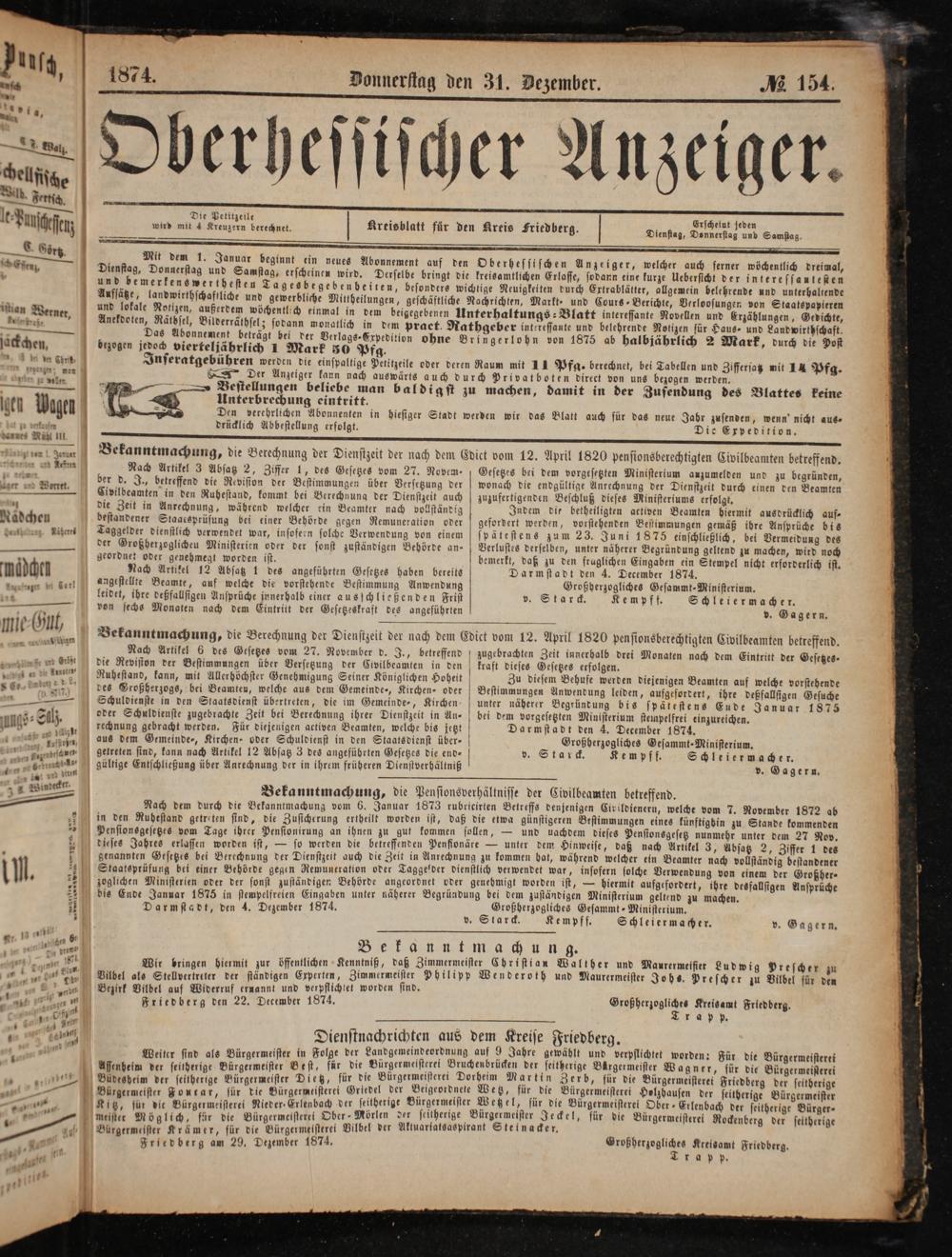 . Mit dem 1. Januar beginnt ein neues Abonnement auf den Oberhessischen Anzeiger, welcher auch ferner wöchentlich dreimal, Dienstag, Donnerstag und Samstag, erscheinen wird. Derselbe bringt die kreisamtlichen Erlasse, sodann eine kurze Uebersicht der interessantesten und bemerkenswerthesten Tagesbegebenbeiten, besonders wichtige Neuigkeiten durch Extrablätter, allgemein belehrende und unterhaltende Aufsätze, landwirthschaffliche und gewerbliche Mittheilungen, geschäftliche Nachrichten, Markt- und Cours Berichte, Verloosungen von Staatspapieren und lokale Notizen, außerdem wöchentlich einmal in dem beigegebenen Unterhaltungs⸗Blatt interessante Novellen und Erzählungen, Gedichte, Anekdoten, Rätbsel, Bilderräthsel; sodann monatlich in dem praet. Rathgeber interessante und belehrende Notizen für Haus- und Landwirthschaft.