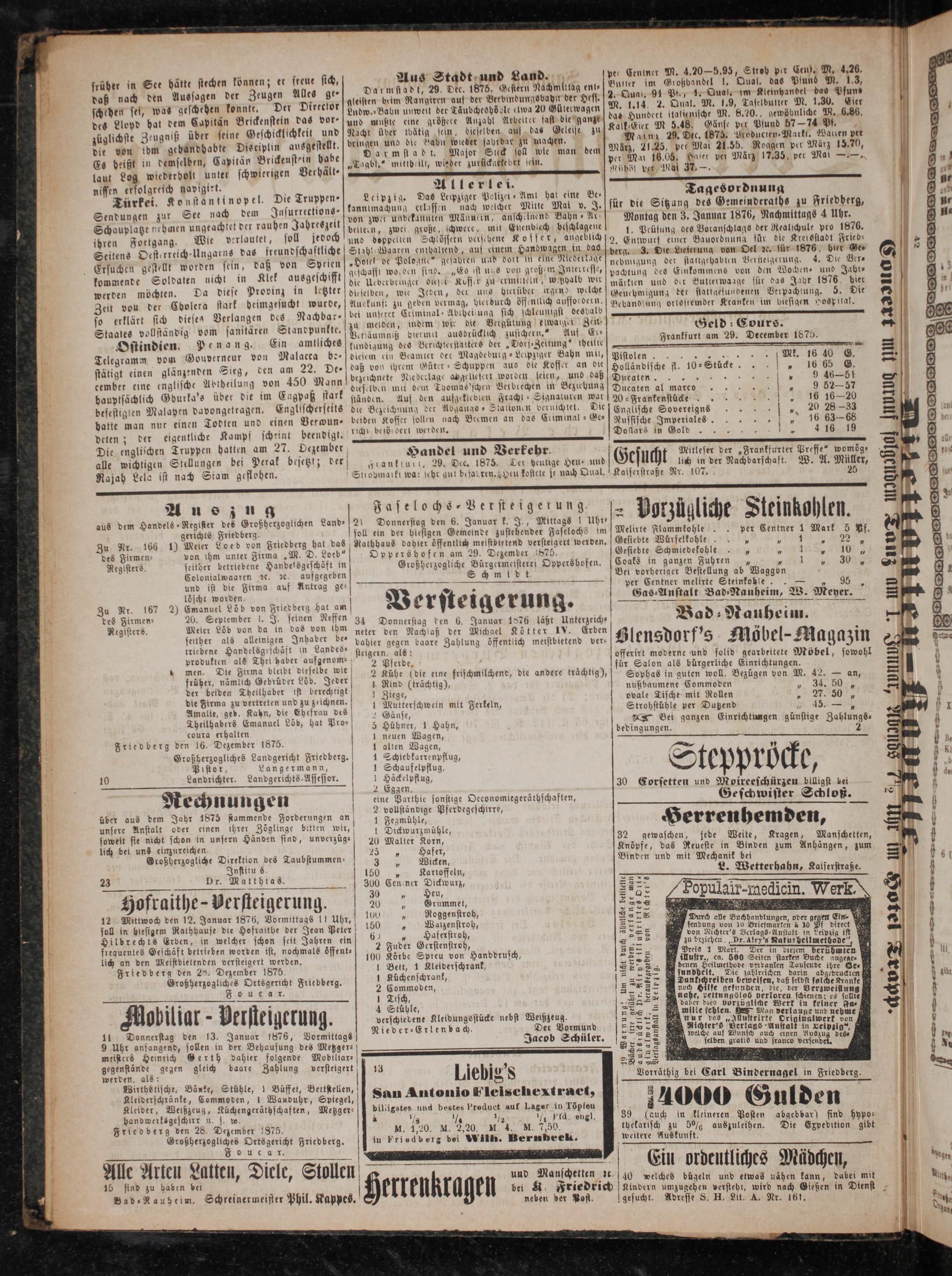 Handel und Verkehr. Frankfubt, 29. Dec. 1875. Der heutige Heu- und Suobmarkt war sehr gut besap ren. 2 Heu kostete je nach Qual,
