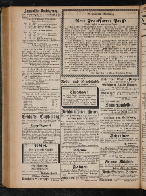 erscheint täglich in zwei ganzen Bogen. 5 Ihre Tendenz bleibt unverändert dieselbe: Vertretung der nationalen Interessen im Reiche, Förderung der liberalen Bestrebungen in Staat und Gemeinde. Ihr Inhalt ist 9 wesentlich bereichert worden; derselbe umfaßt rasche Berichterstattung über alle politischen Vorkommnisse, namentlich ausführliche Berichte über die Reichstags⸗ und Landtags⸗Verhand⸗ N. lungen Preußens, wie sämmtlicher süddeutschen Staaten, orientirende Leitartikel über alle Tageefragen, gediegene wissenschaftliche Abhandlungen und Feuilletons und eine reichhaltige Kleine Chronik. 9 Die Börsenhalle bringt prompte und zuverlässige Börsen- und Handelsberichte von Frankfurt, Berlin, Wien, Paris, London zc., nebst Telegrammen über Politik, Börse und Handel aus allen Haupfplätzen, ein vollständiges Coursblatt der hiesigen Börse und sämmt⸗ liche Verloosungslisten, welche für süddeutsche Leser Interesse haben. 05 Unser tägliches belletristisches Beiblatt:„Das Museum“ ist ein gern gesehener! Gast in jeder Familie. Dasselbe veröffentlicht Romane und Novellen von den besten 05 Autoren, interessante Reiseberichte, Schilderungen aus der Natur und dem Leben. Theater und Kunst finden darin besondere Beachtung. 05 85 Der Abonnementspreis per Vierteljahr beträgt: in Frankfurt a. M., den Staaten des 8 i Deutschen Reiches, sowie Oesterreich und Luxemburg M. 6. 25 Pf. i Inserate sind bei der großen Verbreitung der„Neuen Frankfurter Presse“ welche namentlich! im Großherzogthum Hessen das gelesenste Frankfurter Blatt ist, von besonderer Wirkung. Neu hinzutretende hiesige Abonnenten erhalten die bis Ende Juni erscheinenden Nummern 5 gratis. Neu hinzutretenden auswärtigen Abonnenten senden wir die bis Ende Juni erschei⸗ nenden Nummern nach gefälliger Aufgabe ihrer Adresse unter Kreuzband franco. 98 Frankfurt a. M. im Junt 1876.