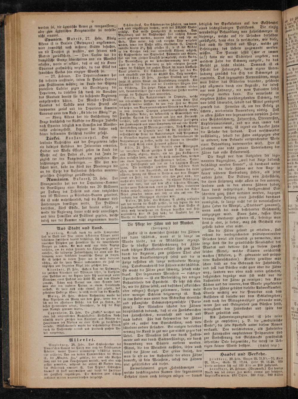 Um die Zähue gesund zu erhalten, sind erstens die vorbezeichneten prädisponirenden Ursachen soviel als thunlich zu vermeiden, man sorge stets für die gründlichste Reinlichkeit des Mundes und bediene sich zu diesem Zwecke solcher Mittel, welche Säuren unschädlich machen(Alkalien, z. B. gebrangte und präpa⸗ rirte Austernschaalen). Kinder gewöhne man schon früh an den Gebrauch der Zahnbürste, und soll das Bürsten nicht quer über die Zähne weg, sondern von oben nach unten geschehen,