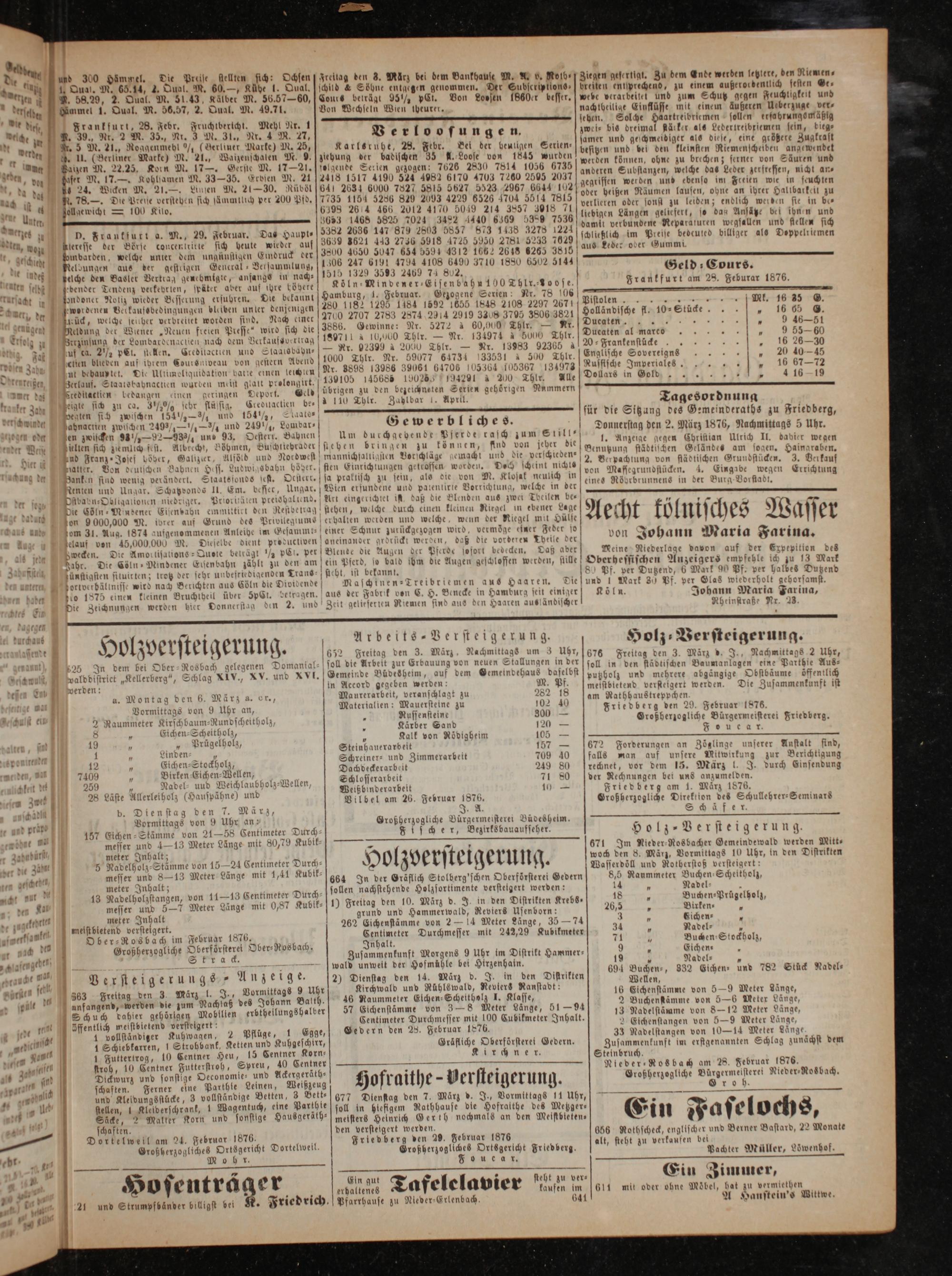 Geld Cours. Frankfurt am 28. Feburar 1876. Tr Mt. 16 35 G. Holländische fl. 10⸗Stücke.„5 Ducaten. 4 e. 2 9 46—51 Ducaten al mare 3 9 55-60 20⸗Frankenstücke„„ 16 26—30 Englische Sovereigns 5„ 20 40—45 Russische Imperiales. 1„ 16 67—72 Dollars in Gold. 5 416 19