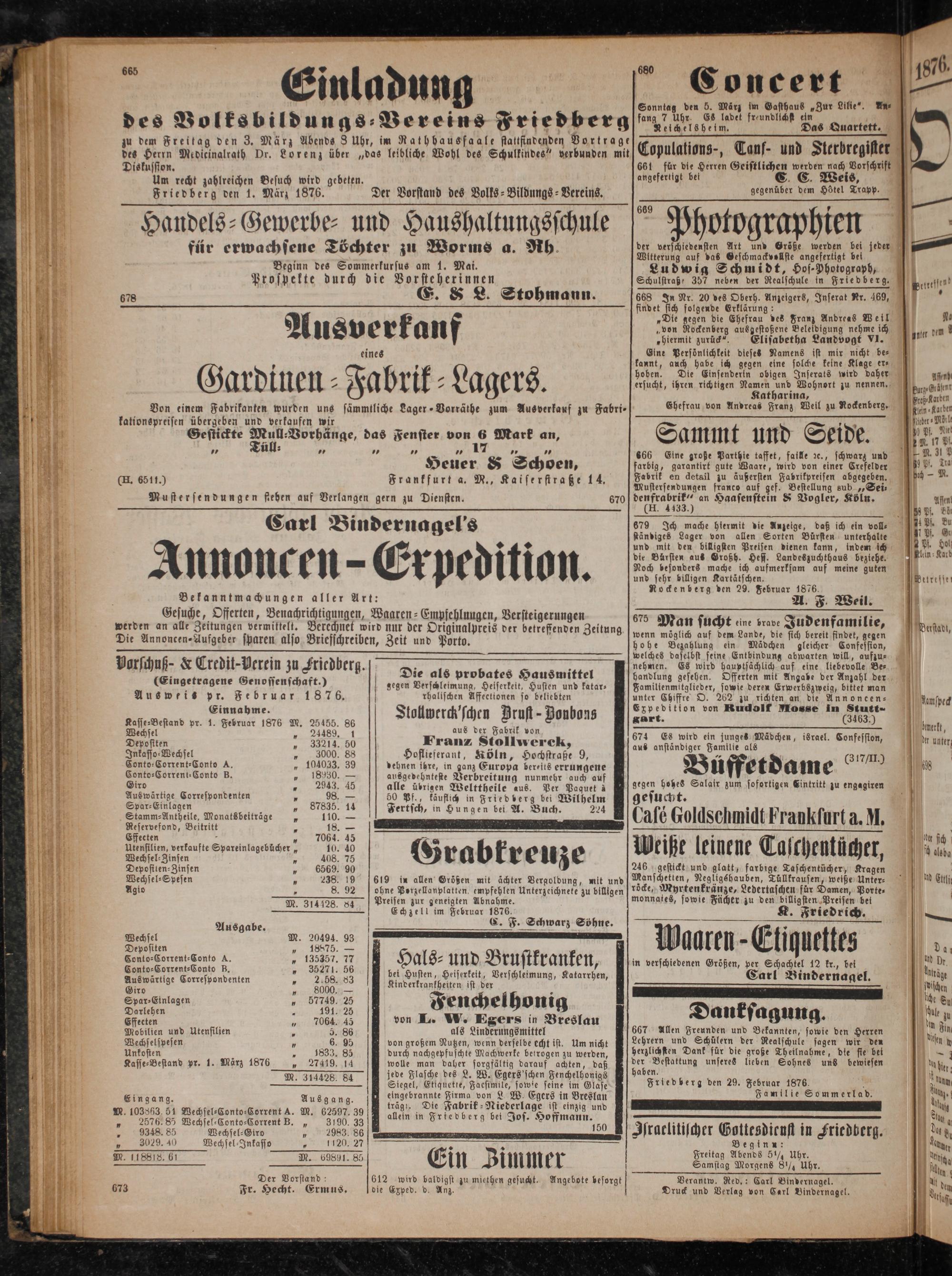 Vorschuß-& Credit Verein zu Friedberg Die ale„ (Eingetragene Genossenschaft.) gegen Verschleimung, Heiserkeit, Husten und katar— Ausweis pr. Februar 1876. rhalischen Affeetionen so beliebten i 1 Einnahme. Stollwerck'schen Zrust-Donbons Kasse⸗Bestand pr. 1. Februar 1876 M. 25455. 86 Wechsel„ 24489. 1 aus der Fabrik von Depositen 33214. 50 Franz Stollwerck, Inkasso⸗Wechsel„ 3000. 88 Hoflieferant, Köln, Hochstraße 9, Conto⸗Corrent⸗Conto A.„ 104033. 39 dehnen ihre, in ganz Europa bereits errungene Conto⸗Corrent⸗Conto B.„ 18980.— ausgedehnteste Verbreitung nunmehr auch auf Giro„ alle übrigen Welttheile aus. Per Paquet à Auswärtige Correspondenten 1 98.— 50 Pf., käuflich in Friedberg bei Wilhelm Spar⸗Einlagen„ 87835. 14 Fertsch, in Hungen bei A. Buch. 224 Stamm ⸗Antheile, Monatsbeiträge N 110.— Reservefond, Beitritt 5 18.— Effecten 11 8 n 7064. 45 7 Utensilien, verkaufte Spareinlagebücher„ 10. 40 8 bk 2 Wechsel⸗Zinsen„ 408. 75 Gra reuze Depofiten⸗Zinsen„ 6569, 90 Wechsel⸗Spesen 7 238. 619 in allen Größen mit ächter Vergoldung, mit und Agio 7 8. 92 ohne Porzellanplatten, empfehlen Unterzeichnete zu billigen Preisen zur geneigten Abnahme. . Echzell im Februar 1876. Ausgabe. G. F. Schwarz Söhne. Wechsel M. 20494. 93 Depositen 5 88 een. A. 7 5 77 Hals⸗ und Brustkranken, Conto⸗Corrent⸗Conto B.„ 35. 58 j N; Auswärtige Correspondenten„ 288883 e eee ee. 8. Giro„ 8000.— 2 Spar Einlagen„ 57749. 25 Fenchelhonig Darlehen 4 191. 25. Effecten„1 706 45 von L. W. Egers in Breslau Mobilien und Utensilien 5 5. 86 als Linderungsmittel Wechselspesen 1 6. 95 von großem Nutzen, wenn derselbe echt ist. Um nicht Unkosten 1833. 85 durch nachgepfuschte Machwerke betrogen zu werden, Kasse⸗Bestand pr. 1. März 1876 27419. 14 wolle man daher sorgfältig darauf achten, daß M. 314428. 8 jede Flasche des L. W. Egers'schen Fenchelhonigs Siegel, Etiquette, Faesimile, 275 seine im Glase eingang. ausgang. I ingtbrannte Pune von L. Egers in Breslau M. 103863. 51 Wechsel⸗Conto⸗Corrent A. M. 62597. 39 ane e eee eee 9 2576.85 Wechsel⸗Conto-⸗Corrent B.„ 3190. 33 J. 150 948 85 Wechsel⸗Giro N 2983. 86 „ 3029. 40 Wechsel⸗Inkasso„ 120,27 f 5 M. 88. 61 M. 69891. 85 Ein Zimmer Der Vorstand: 612 wird baldigst zu miethen gesucht. Angebote besorgt 673 Fr. Hecht. Ermus. die Exped. d. Anz.