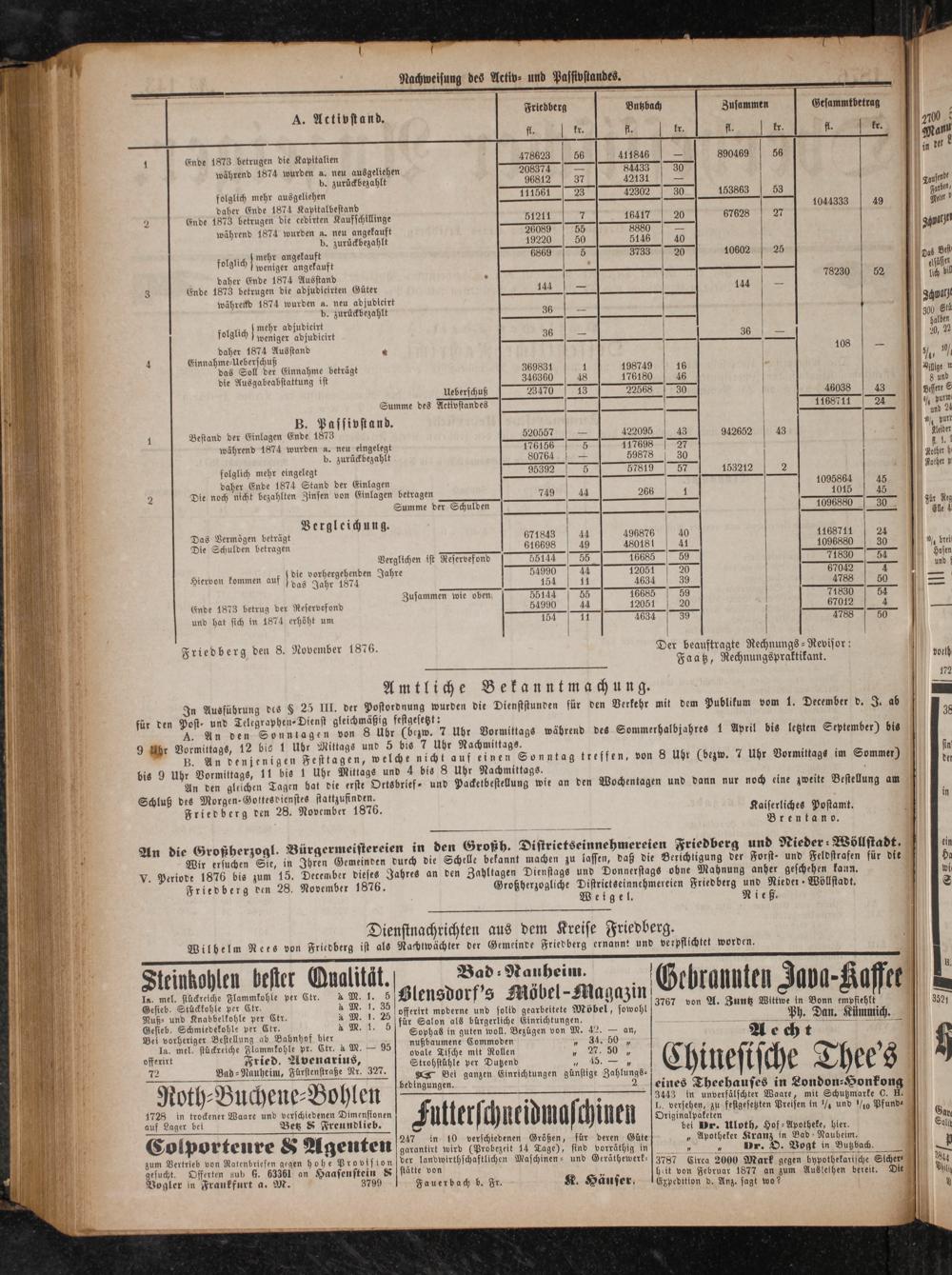 A. An den Sonntagen von 8 Uhr 9 Abr Vormittags, 12 bis 1 Ubr Mittags und 5 B. An denjenigen Festtagen, bis 9 Uhr Vormittags, 11 bie 1 Uhr Mittags un An den gleichen Tagen bat die erste Orts Schluß des Morgen-Gottesdienstes stattzufinden. Friedberg den 28. November 1876.