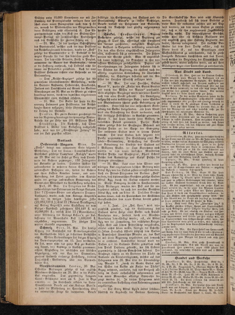 — 30. Mai. Der neue Herrscher, Sultan Murad V., wurde als„Kaiser von Gottes Gnaden und durch den Willen der Nation“ proclamirt. Sein abgesetzter Vorgänger wurde mit seiner Familie nach dem alten Serail gebracht. Die Umwälzung vollzog sich unter vollständiger Rube; unter Christen und Muselmännern scheint große Befriedigung zu herrschen. Heute früh hat eine entsprechende Kund⸗ gebung des Volkes stattgefunden. Für heute Abend wird eine Beleuchtung der Stadt vorbereitet, auch sind dreitägige Festlichkeiten in Aussicht genommen. Murad V. hat heute bereits seine Residenz im kaiserlichen Palais genommen. Pariser Nach— richten zufolge steht der Großvezier Mehemed mit Midhat Pascha an der Spitze der Bewegung Der entthronte Sultan wird in seinem Palais bewacht. Der neue Sultan habe folgende drei Punkte angenommen: Die Einführung einer No- tabeln-Versammlung, Abschaffung des Serails und Reducirung der Civilliste des Sultans auf 5 Millionen Piaster.— Dem Vernehmen nach würden in dem neuen türkischen Ministerium Midhat Pascha das Großvezirat, Khalil Scherif Pascha das Auswärtige und Sadyk Pascha die Finanzen übernehmen.