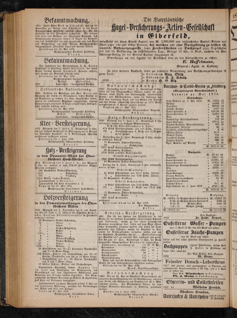 Ausgabe. Wechsel M. 3263. 09 Depositen„ 19601. 43 Conto⸗Corrente A.„ 222381. 37 Conto⸗Corrente B.„ 29453. 20 Auswärtige Correspondenten„ 4162030 Giro„ 10000.— Darlehen 1—. 10 Spar⸗Einlagen„ 42496. 07 Stamm Antheile,* 755. 25 Haus⸗Reparaturen⸗Conto 5 93. 90 Wechselspesen Conto— 5.— Unkosten⸗Conto 5 912. 48 Kasse⸗Bestand pr. 1. Juni 1876„ 27337. 66