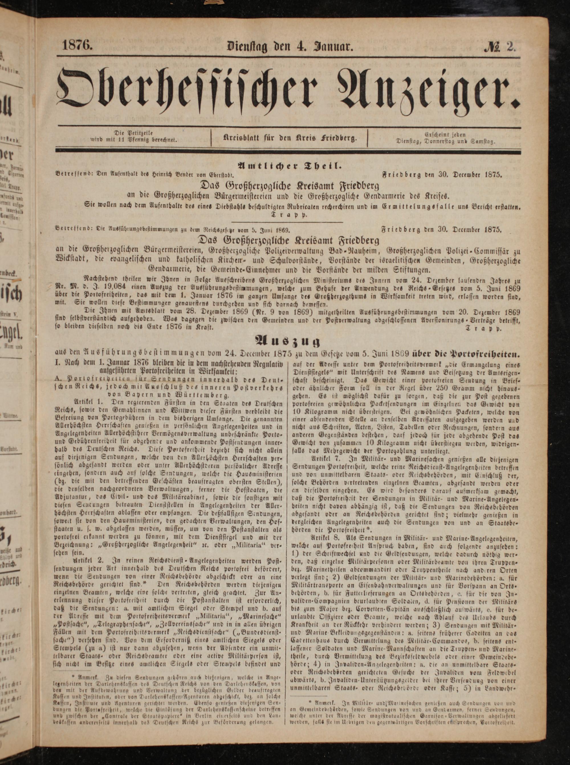 Die Ihnen mit Amtsblatt vom 28. Dezember sind selbstverständlich aufgehoben. so bleiben dieselben noch bis Ende 1876 in Kraft.