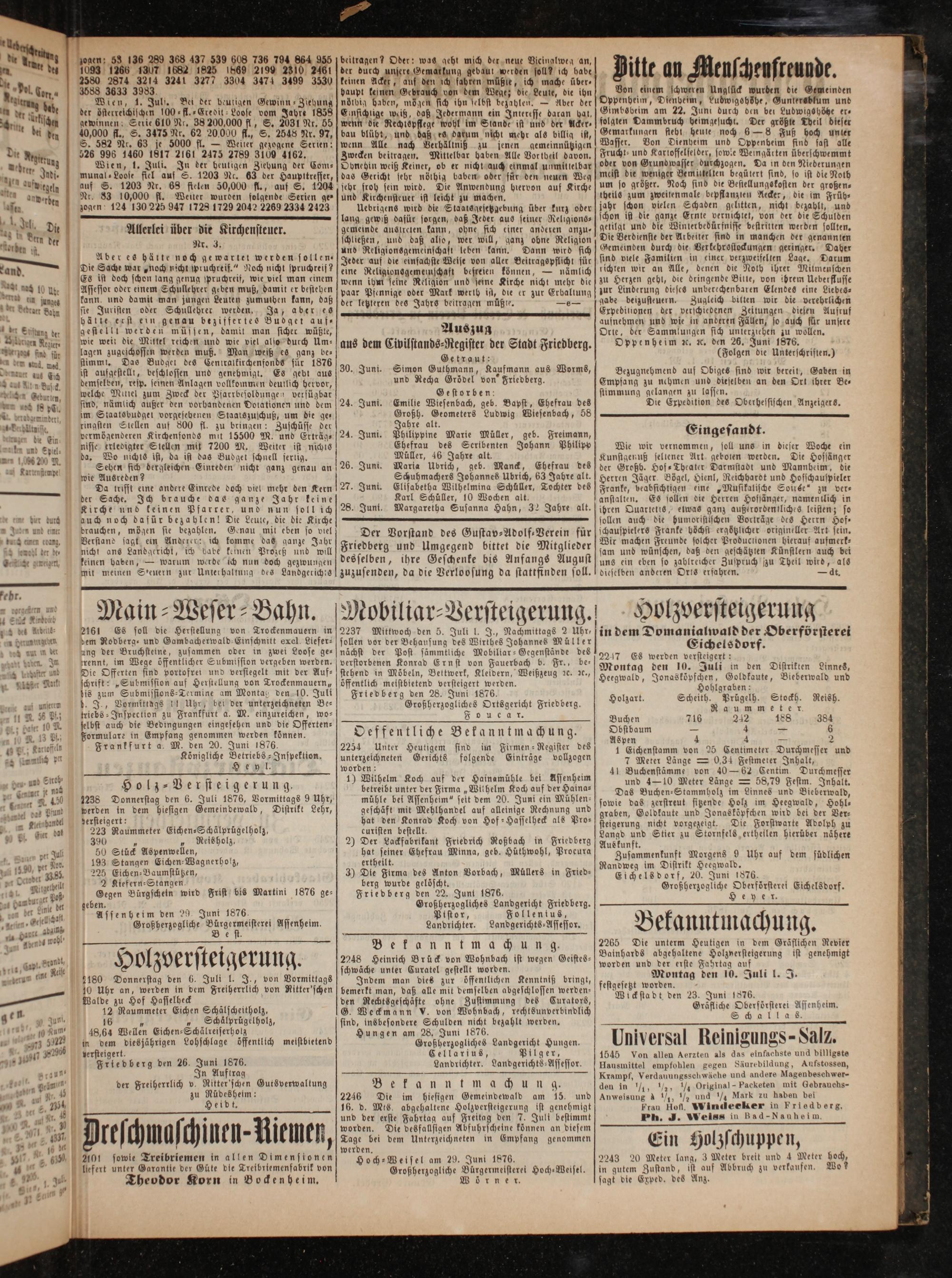 2265 Bainhards abgehaltene Holzyersteigerung worden und der erste Fahrtag auf Montag den 10. Juli l. J. festgesetzt worden. a Wickstadt den 23. Juni 1876. Graäfliche Oberförsterei Assenheim.