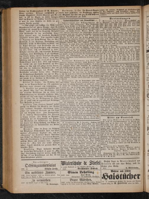 Braunschweigische Thlr. 20⸗Loose von 1868. Bei der am 1. d. M. stattgefundenen Verloosung wurden folgende Serien gezogen: 65 95 637 759 874 919 1088 1207 1408 1687 1795 1838 1874 1958 2126 2397 2818 2842 3129 3203 3274 3766 3881 4139 4140 4240 4511 4606 5027 5210 5217 5330 5417 5429 5765 5820 5879 5882 6001 6247 6591 6804 6840 7038 7148 7281 7315 7390 7423 7512 7566 7612 7695 8040 8504 8537 8597 8784 8799 8999 9039 9369 9401 9601 9628 9870 9886 und 9966. Die Prämien-⸗Ziehung erfolgt am 1. December.