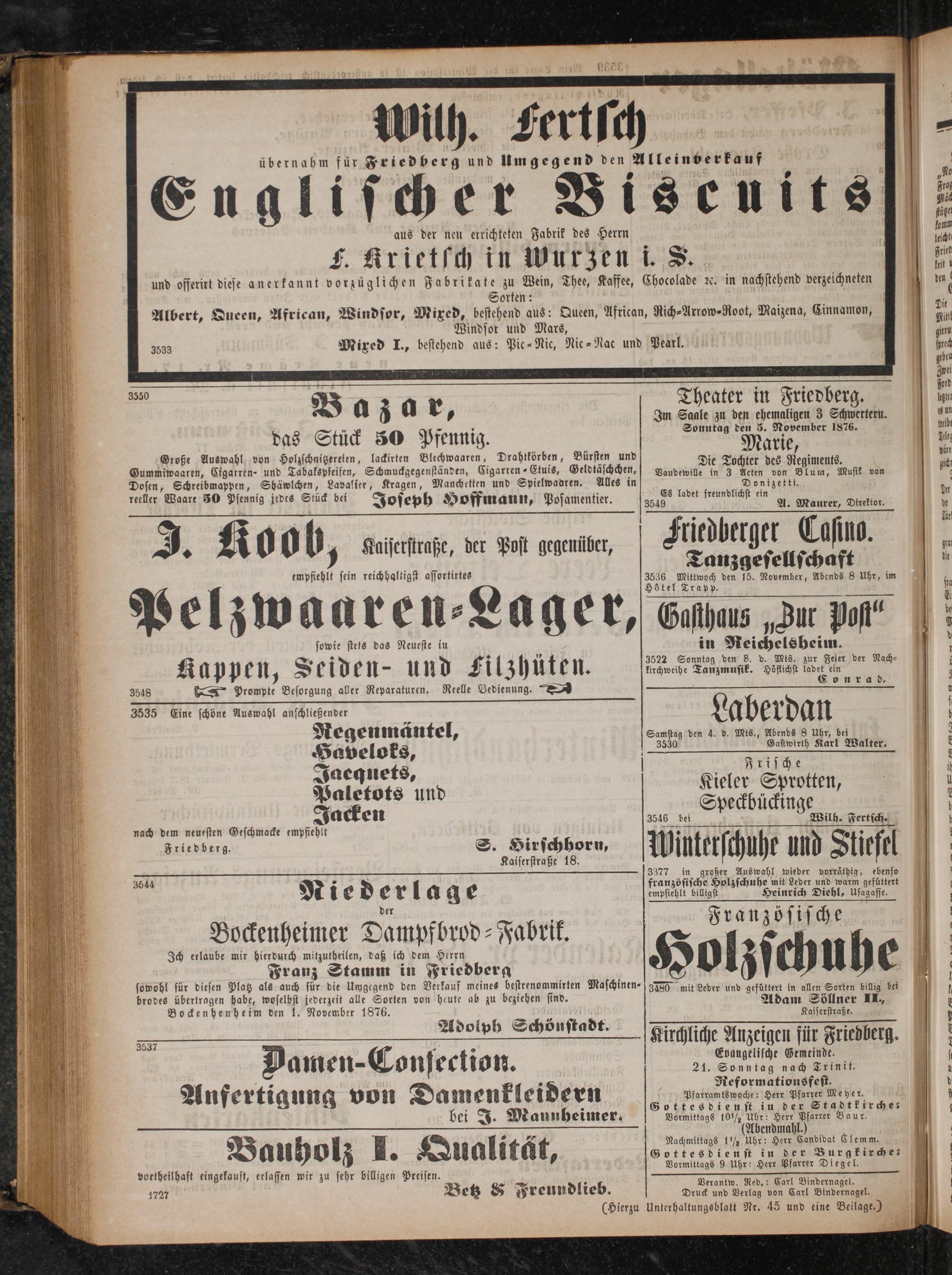 Druck und Verlag von Carl Bindernagel. Unterhaltungsblatt Nr. 45 und eine Beilage.)