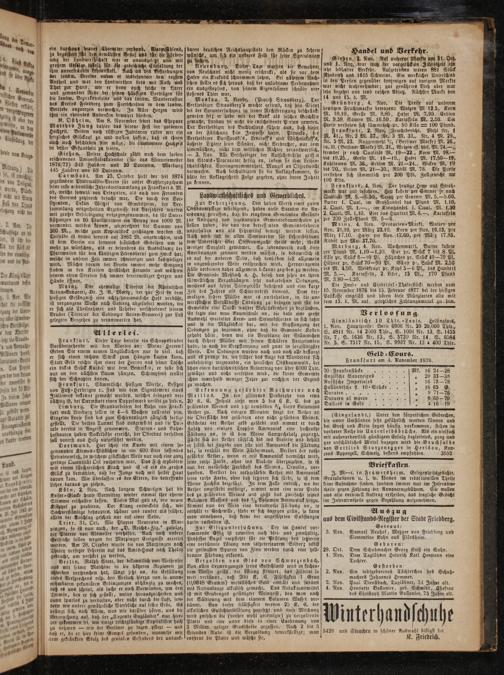Frankfurt, 2. Nov, Fruchtbericht. Mehl Nr. 1 M. 41., Nr. 2 M. 37., Nr. 3 M. 33., Nr. 4 M. 29., Nr. 5 M. 23. Roggenmehl%(Berliner Marke) M. 26., do. II.(Berliner Marke) M. 21., Weizen eff. hies. M. 24.—., fremder je nach Qualität M. 19—22., Korn M. 18.— bis 19.25., Gerste M. 18—19., Hafer M. 17.50— 19. Kohlsamen M. 36., Erbsen M. 21—24., Wicken M. 19 bis 20., Linsen M. 21—30., Rüböl M. 78. Die Preise verstehen sich sämmtlich per 200 Pfd. Zollgewicht 100 Kilo.