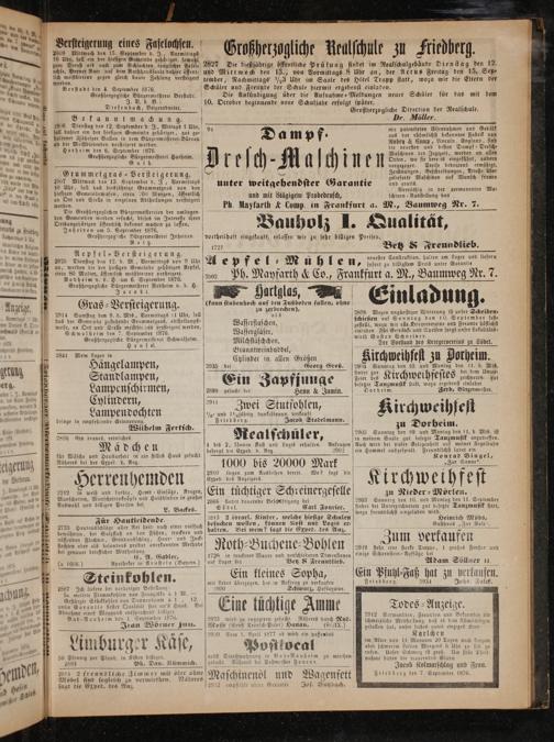 — werden. baare Zahlung versteigert tember, Nachmittags ½3 Uhr im Saale des Hötel Trapp statt, wozu wir die Eltern der 1 8 N Berstadt den 4. September 1876. Schüler und Freunde der Schule hiermit ergebenst einladen. a l a Großherzogliche Bürgermeisterei Berstadt. Die Ankündigung über die Aufnahme-Meldungen neuer Schüler für das mit dem J. 10. October beginnende neue Schuljahr erfolgt später.