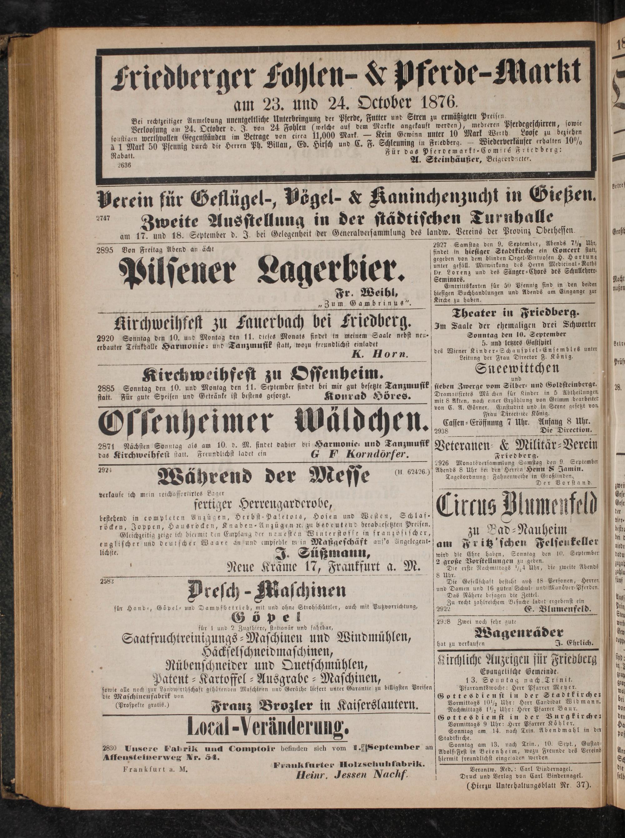 à 1 Mark 50 Pfeunig durch die Herren Ph. Billau, Ed. Hirsch und C. F. Schleuning in Friedberg.— Wiederverkäufer erhalten 10% Rabatt. Für das Pferdemarkt⸗Comité Friedberg: 2636 A. Steinhäußer, Beigeordacter.