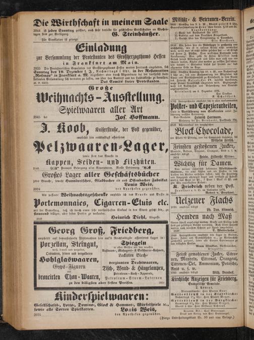3935 Die Protestantischen Gemeinden des Großherzogthums Hessen werden hierdurch eingeladen, sich Sonntag den 10. Dezember l. J., Nachmittags 1 uhr, in der Restauration „RNosenau“ in Frankfurt a. M. eirzufinden oder durch Abgeordnete bei der dortselbst statt- findenden Versammlung sich vertreten zu lassen, um über den Austritt aus der Landeskirche zu berathen. D. F. 6488) Das Comité freier Protestanten.
