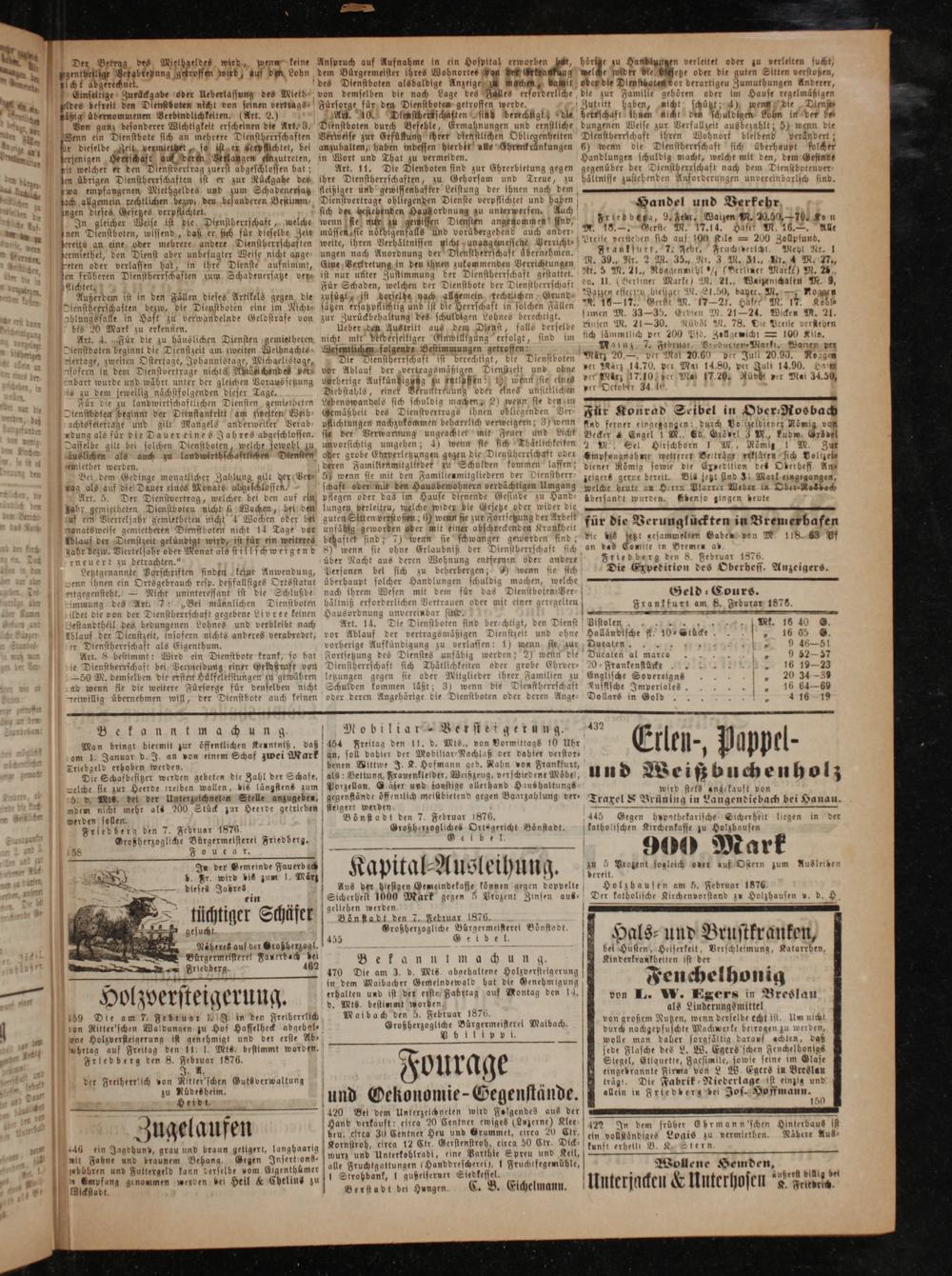 rneuert zu betrachten.“ über Nacht aus deren Wohnung entfernen oder andere Friedberg den 8. Februax 1876. Letztgenannte Vorschriften finden keine Anwendung, Personen bel sich zu beherbergen; 9) wenn sie sich Die Expedition des Oberhess. Anzeigers. Zenn ihnen ein Ortsgebrauch resp. deßfallsiges Ortsstatut überhaupt solcher Handlungen schuldig machen, welche nitgegensteht.— Nicht uninteressant ist die Schlußbe- nach ihrem Wesen mit dem für das Dienstboten-Ver⸗ Geld⸗Cours.