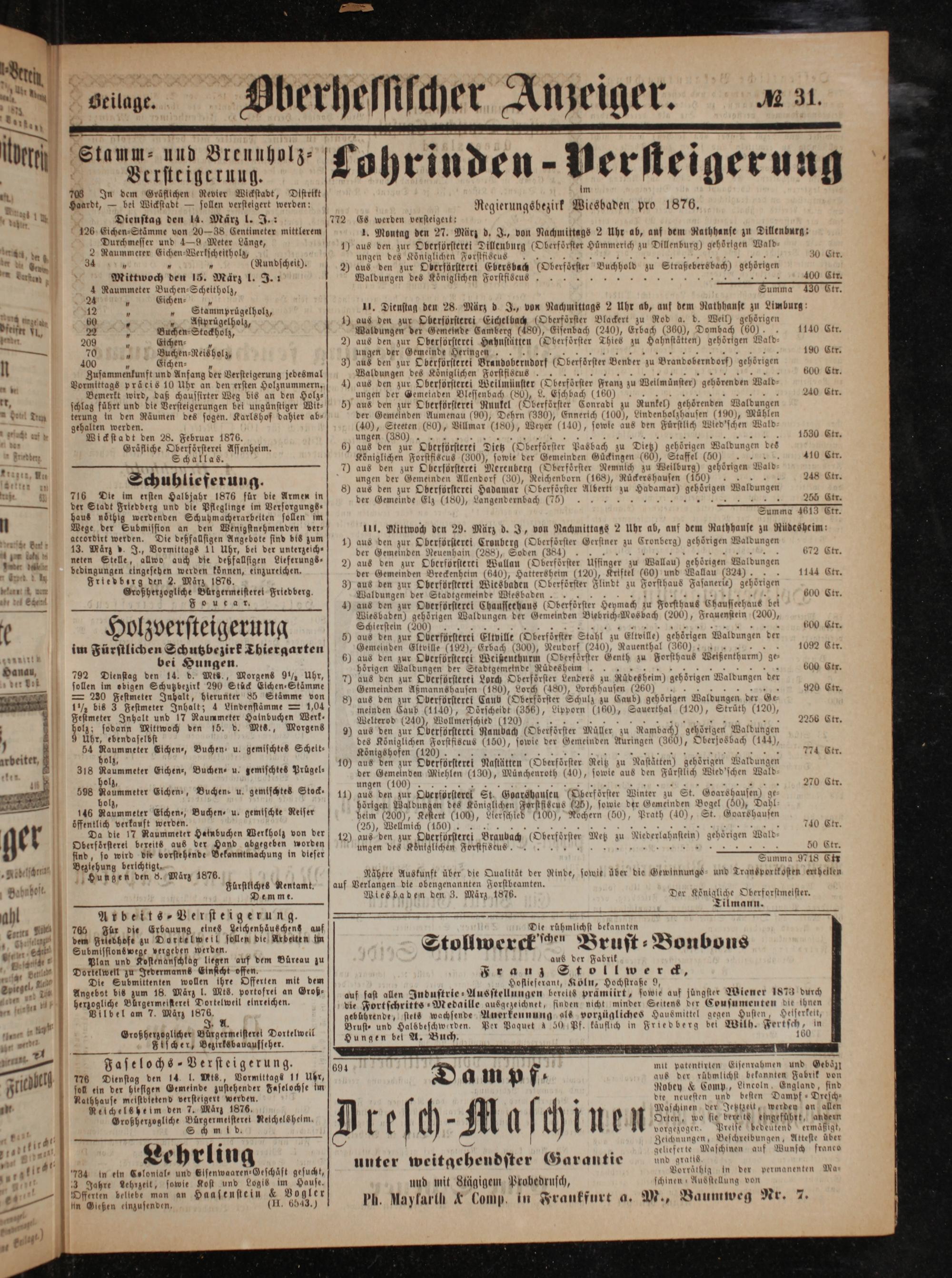 24 1 Eichen⸗* 1 12 1„ Stammprügelholz, 5 Jungen 60 1„ Astprügelholz, seiftt FI, 22 5 Buchen⸗Stockholz, n 209 5 Eichen⸗ 5 ä 70 4 Baben⸗ Reisholz, U 40⁰ Eichen Zusammenfunft und Anfang der Versteigerung jedesmal 1 Vormittags präeis 10 Uhr an den ersten Holznummern. Bemerkt wird, daß chaussirter Weg bis an den Holz⸗ d, schlag führt und die Versteigerungen bei ungünstiger Wit⸗ * erte Den terung in den Räumen des sogen. Karlshof dahier ab— 3 gehalten werden. 2 Wickstadt den 28. Februar 1876. — Gräfliche Oberförsterei Assenheim. reden Schallas. Tage N N Schuhlieferung. eg 10 716 Die im ersten Halbjahr 1876 für die Armen in ——-— der Stadt Friedberg und die Pfleglinge im Versorgungs⸗ haus noͤthig werdenden Schuhmacherarbeiten sollen im IL Wege der Submission an den Wenigstnehmenden ver⸗ 6 but actordirt werden. Die deßfallsigen Angebote sind bis zum N 1 0 13. März d. J., Vormittags 11 Uhr, bei der unterzeich⸗ L* K neten Stelle, allwo auch die deßfallsigen Lieferungs- —** bedingungen eingesehen werden konnen, einzureichen. ten e u Friedberg den 2. März 1876. nt t dem Großherzogliche Bürgermeisterel Friedberg. S820 Fouc ar. 0 Holzversteigerung im Fürstlichen Schutzbezirk Thiergarten Pan bei Hungen. Dana, 792 Dienstag den 14. d. Mts., Morgens 9½ Uhr, n sollen im obigen Schutzbezirk 290 Stück Eichen⸗Stämme 2= 230 Festmeter Inhalt, hierunter 85 Stamme von