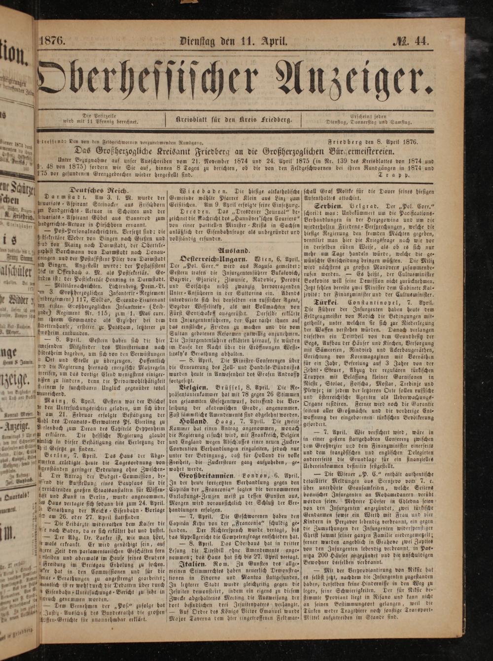 Türkei. Constantinopel, 7. April. Die Führer der Insurgenten haben heute dem Feldzeugmeister von Rodich die Bedingungen mit— getheilt, unter welchen sie sich zur Niederlegung der Waffen verstehen würden. Danach verlangen dieselben ein Drittheil von dem Grund besitz der Begs, Aufbau der Häuser und Kirchen, Versorgung mit Sämereien, Rindvieb und Ackerbaugeräthen, Errichtung von Kornmagazinen mit Vorräthen für ein Jahr, Befreiung auf 3 Jahre von der Zebnt Steuer, Abzug der regulären türkischen Truppen mit Belassung kleiner Garnisonen in Niesie, Stolac, Fotscha, Mostar, Trebinje und Plewje; in jedem der letzteren Orte sollen russische und österreichische Agenten als Ueberwachungs— Organe residiren. Ferner wird noch die Garantie seitens aller Großmächte und die vorherige Ent- waffnung der eingeborenen türkischen Bevölkerung gefordert.