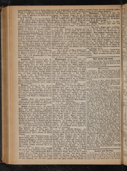 Türkei. Constantinopel. Die„Agence Havas Reuter“ dementirt alle am 4. Juli von Wiener und Pester Journalen veröffentlichten Nachrichten, betr. die angebliche Schwertumgürtung des Sultans am 6. Juli, die Vorbereitung eines Fetyo von Seiten des Scheik ül Islam, sowie endlich über eine von Midhat Pascha entworfene Verfassung und baldigste Proclamirung derselben. Der Bey von Tunis wird ein Regiment nach Con- stantinopel senden.— Der neuernannte Botschafter Aleco Pascha Vogoridis reist morgen nach Wien ab.