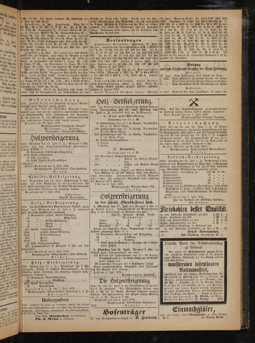 meter Inhalt und 38 dergleichen Stangen mit 4 Kubikmeter Inhalt. Gegen vorschriftsmäßige Bürgschaft wird Zahlungs- frist bis Martini 1877 gestattet. Lich den 8. Juli 1876. Wimmenauer, Forstrath.