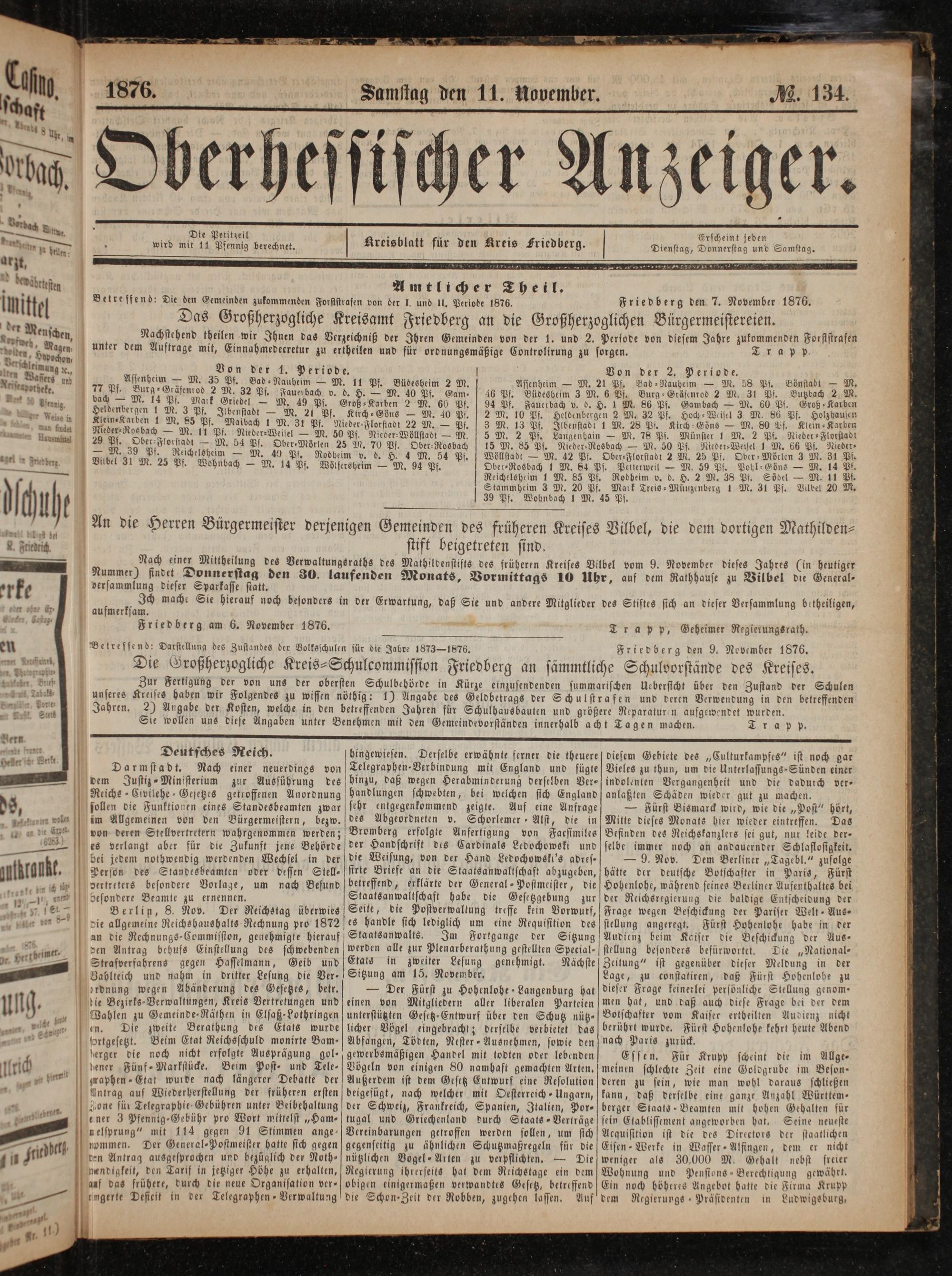 Vor — dach Ute Die Petitzeil 15 105 1 e Erscheint jeden dung ee 0 wird mit 11 Pfennig berechnet. Kreisblatt für den Kreis Friedberg. Dienstag, Donnerstag und Samstag. in arzt, 7 WINE r. denibrusten Amtlicher Theil. 5 J Friedberg den 7. November 1876.