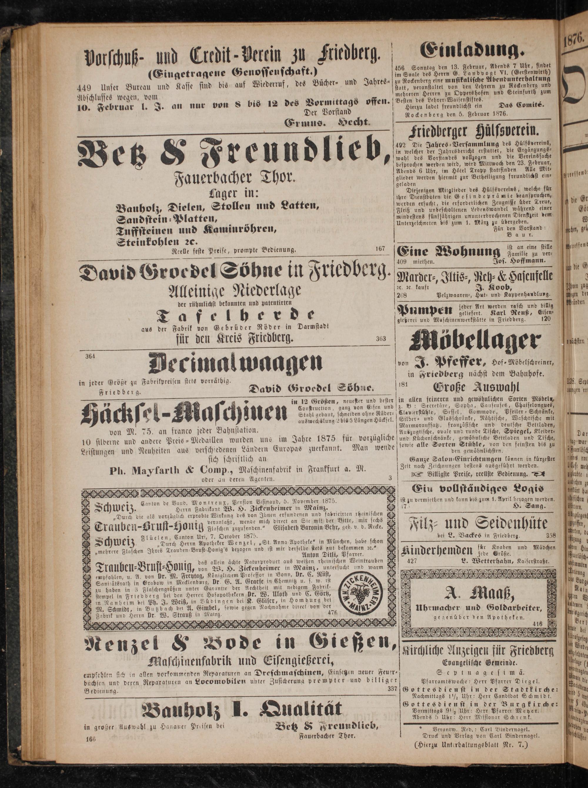 456 Sonntag den 13. Februar, Abends 7 Uhr, findet jm Saale des Herrn G. Landvogt VI.(Gerstenwirth) zu Rockenberg eine musikalische Abendunterhaltung statt, veranstaltet von den Lehrern zu Rockenberg und mehreren Herren zu Oppershofen und Steinfurth zum Besten des Lehrer-Waisenstlftes.