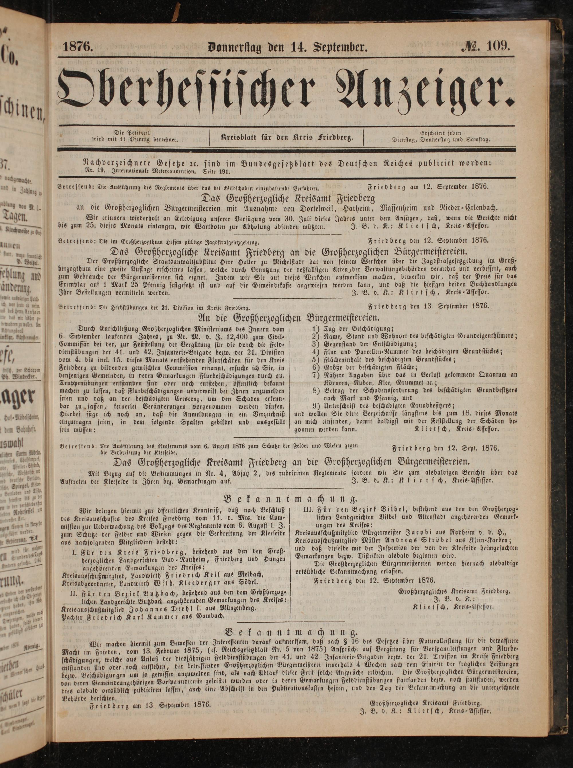 Betreffend: Die Ausführung des Reglements vom 6. August 1876 zum Schutze der Felder und Wiesen gegen; die Verbreitung der Kleeseide. Friedberg den 12. Sept. 1876.
