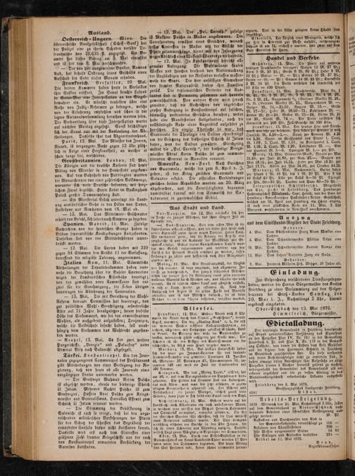 Auszug aus dem Civilstands⸗Register der Stadt Friedberg. Geboren: 4. Mai. Dem Blärstenbinder Franz Adam Winkler eine Tochter. 4. Mai. Dem Schneidermeister Philipp Döpp eine Tochter. 10. Mai. Dem Schneidermeister Konrad Rampe eine Tochter. 12. Mai. Dem Lehrer Valentin Zang ein Sohn. Gestorben: 8. Mai. Friedrich Wilhelm Heß, Metzger, 38 Jahre alt.