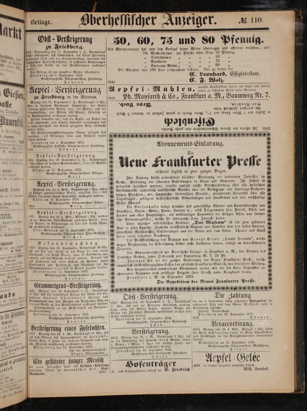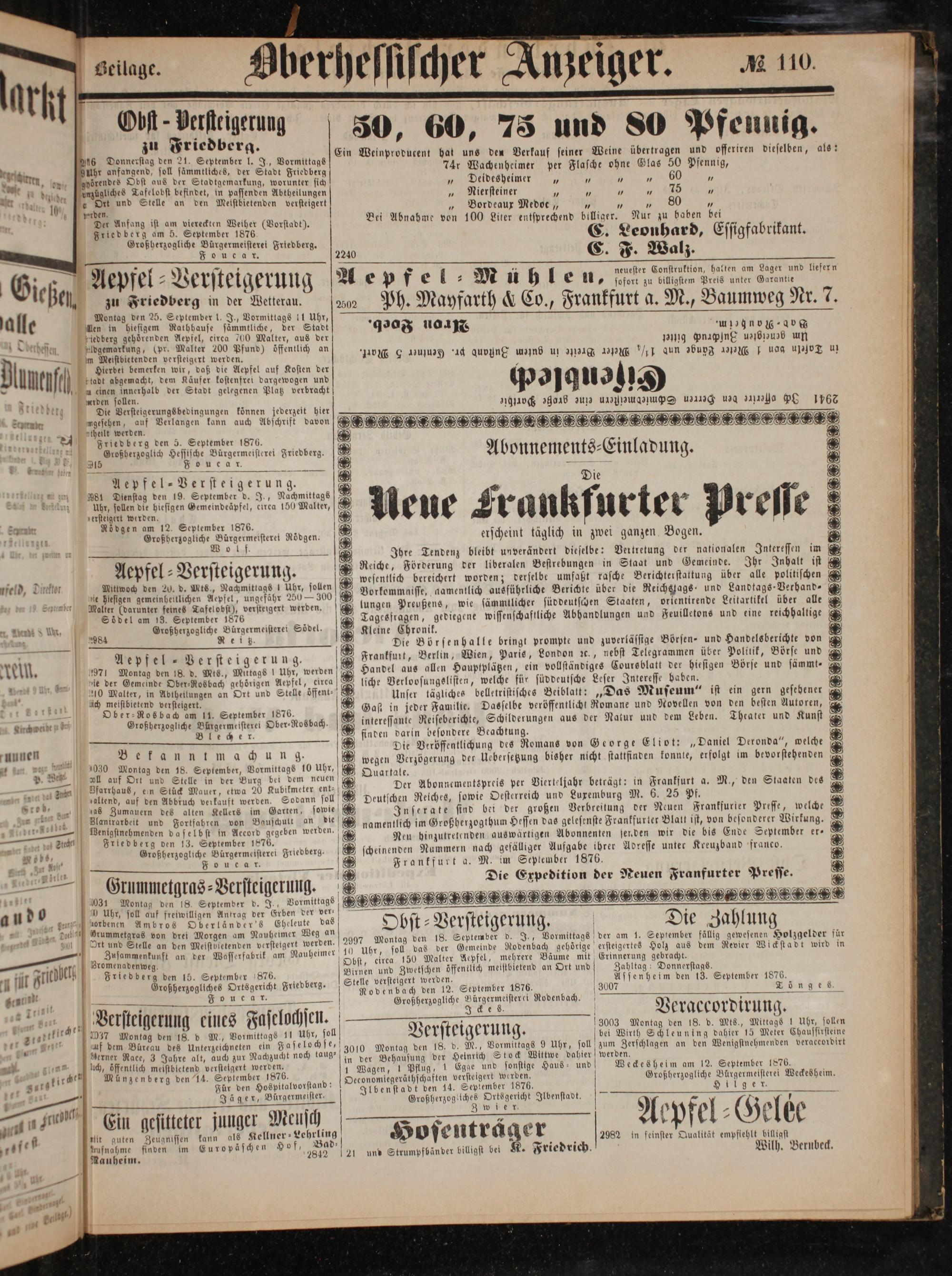 5 N Aepfel ⸗Versteigerung. 1971 Montag den 18. d. Mts., Miktags! Uhr, werden ie der Gemeinde Ober⸗Rosbach gehörigen Aepfel, circa 210 Malter, in Abtheilungen an Ort und Stelle oͤffent⸗ ach meistbietend versteigert. Ober⸗ Rosbach am 11. September 1876. Großherzogliche Bürgermeisterei Ober⸗Rosbach.