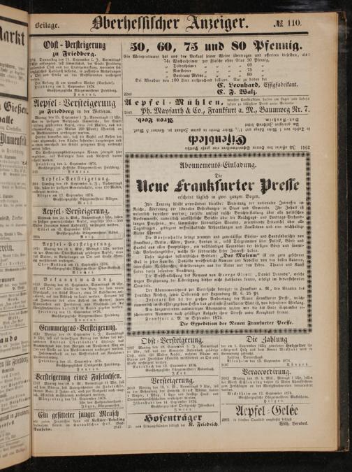 Inserate sind bei der großen Verbreitung der Neuen Frankfurier Presse, welche namentlich im Großherzogthum Hessen das gelesenste Frankfurter Blatt ist, von besonderer Wirkung.
