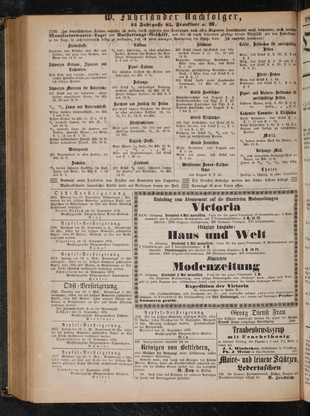Aepfel⸗Versteigerung. 3009 Freitag den 22. d. Mts., Vormittags 10 Uhr anfangend, sollen die der hiesigen Gemeinde zustehenden Aepfel, eirea 300—350 Malter, in Abtheilungen an Ort und Stelle öffentlich meistbietend versteigert werden. Schwalheim den 14. September 1876. Großherzogliche Bürgermeisterei Schwalheim. Hen sel.