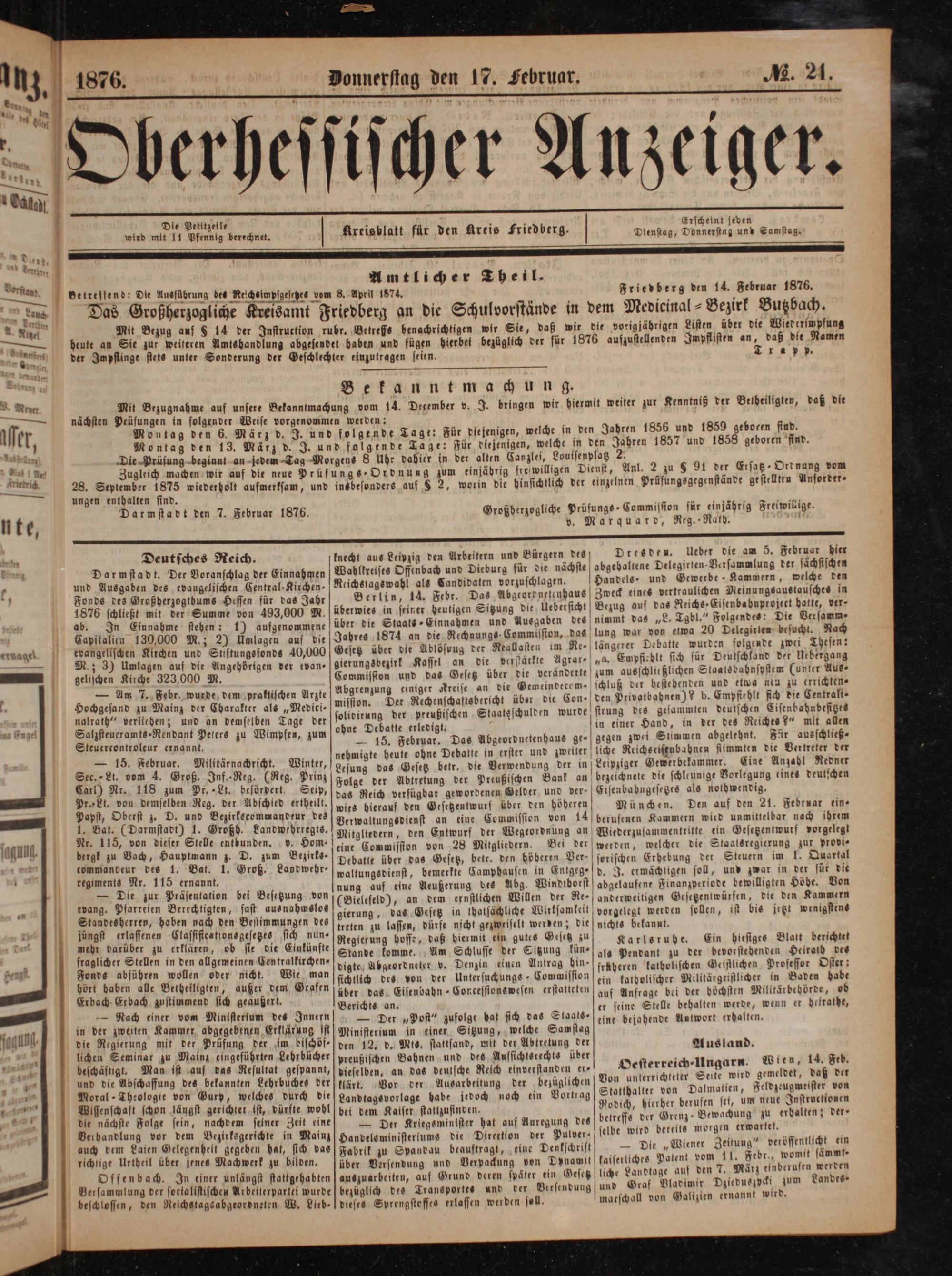 Frienberg den 14. Februar 1876. dem Medicinal- Bezirk Butzbach.