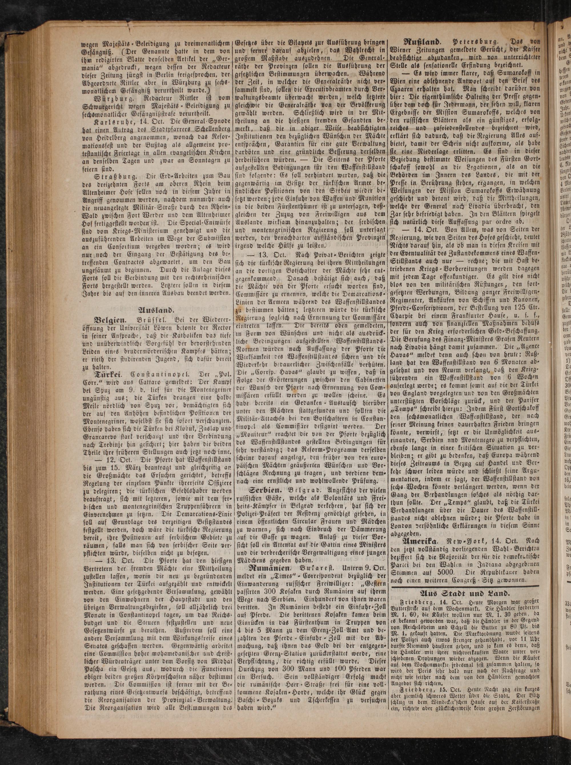 — 12. Oct. Die Pforte hat Waffenstillstand bis zum 15. März beantragt und gleichzeitig an die Großmächte das Ersuchen gerichtet, betreffs Regelung der einzelnen Punkte ihrerseits Offiziere zu delegiren; die türkischen Befehlshaber werden beauftragt, sich mit letzteren, sowie mit dem ser⸗ bischen und montenegrinischen Truppenführern in Einvernehmen zu setzen. soll auf Grundlage des derzeitigen Besitzstandes festgellt werden, doch wäre die türkische Regierung bereit, ihre Positionen auf serbischem Gebiete zu räumen, falls man sich von serbischer Seite ver— pflichten würde, dieselben nicht zu besetzen.
