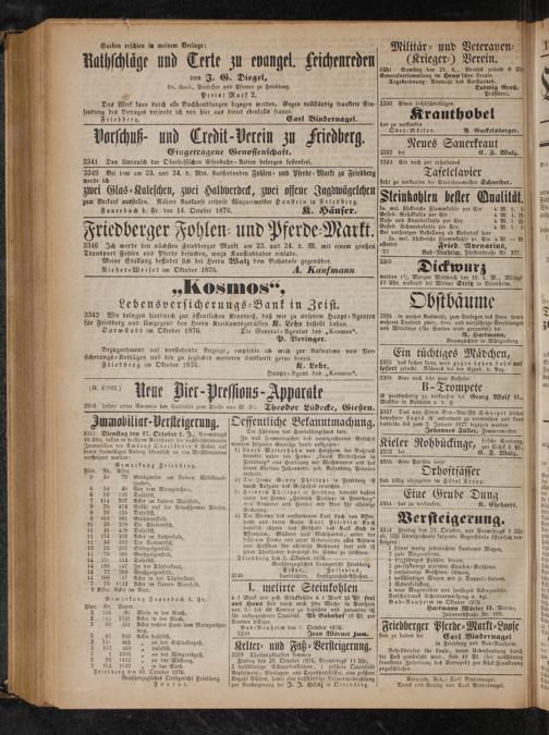Freitag den 20. October 1876, Vormittags 11 Uhr, 2 vollständige Schraubenkeltern, 1 größere Quantität Aepfelwein-, Bierlager- und Transportfässer, eine größere Anzahl Bütten, sowie elne vollständige Brauereieinrichtung zur Versteigerung bei J. J. Hilsz in Ortenberg.