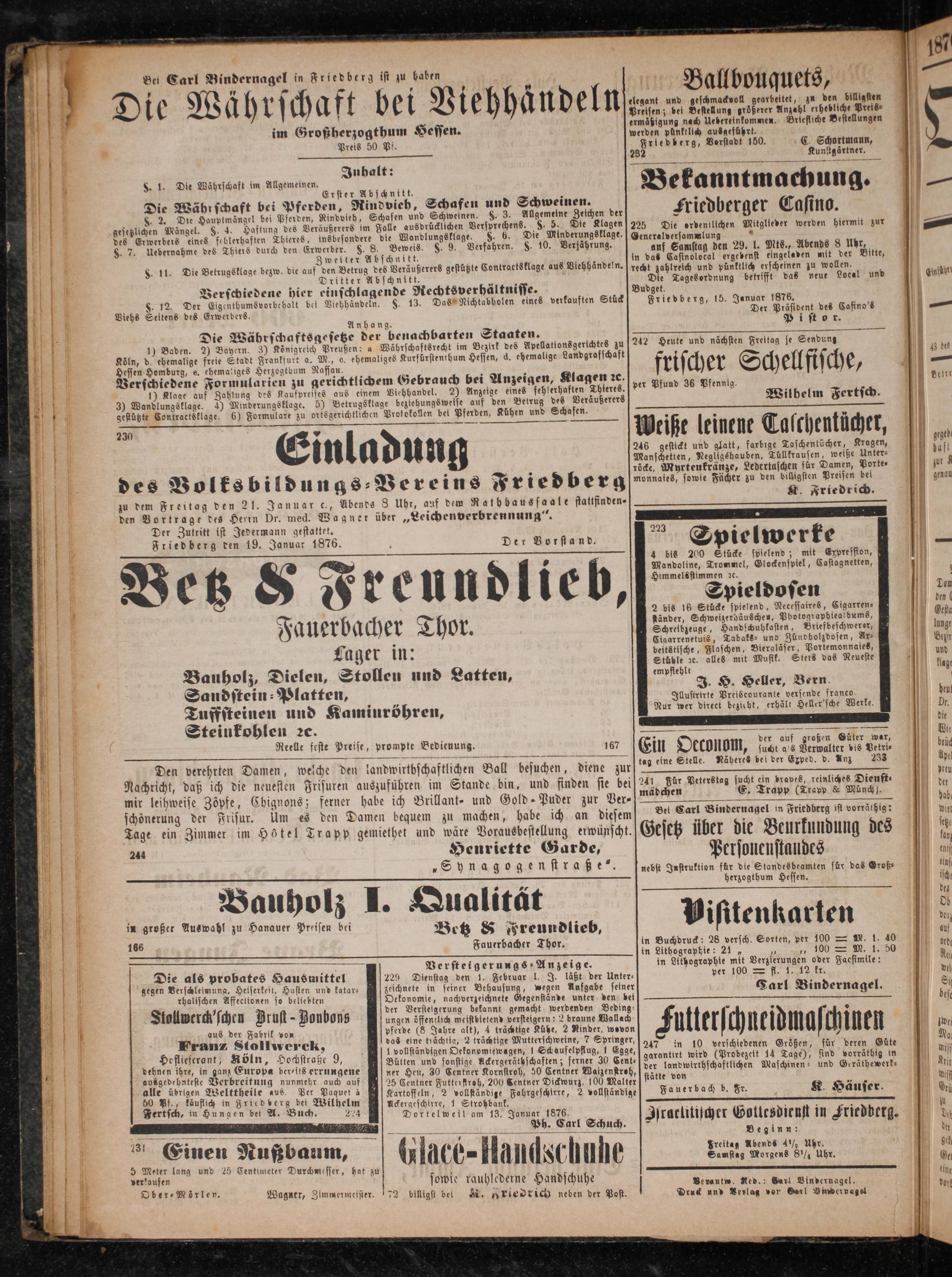 Der Zutritt ist Jedermann gestattet. Friedberg den 19. Januar 1876. Der Vorstand.