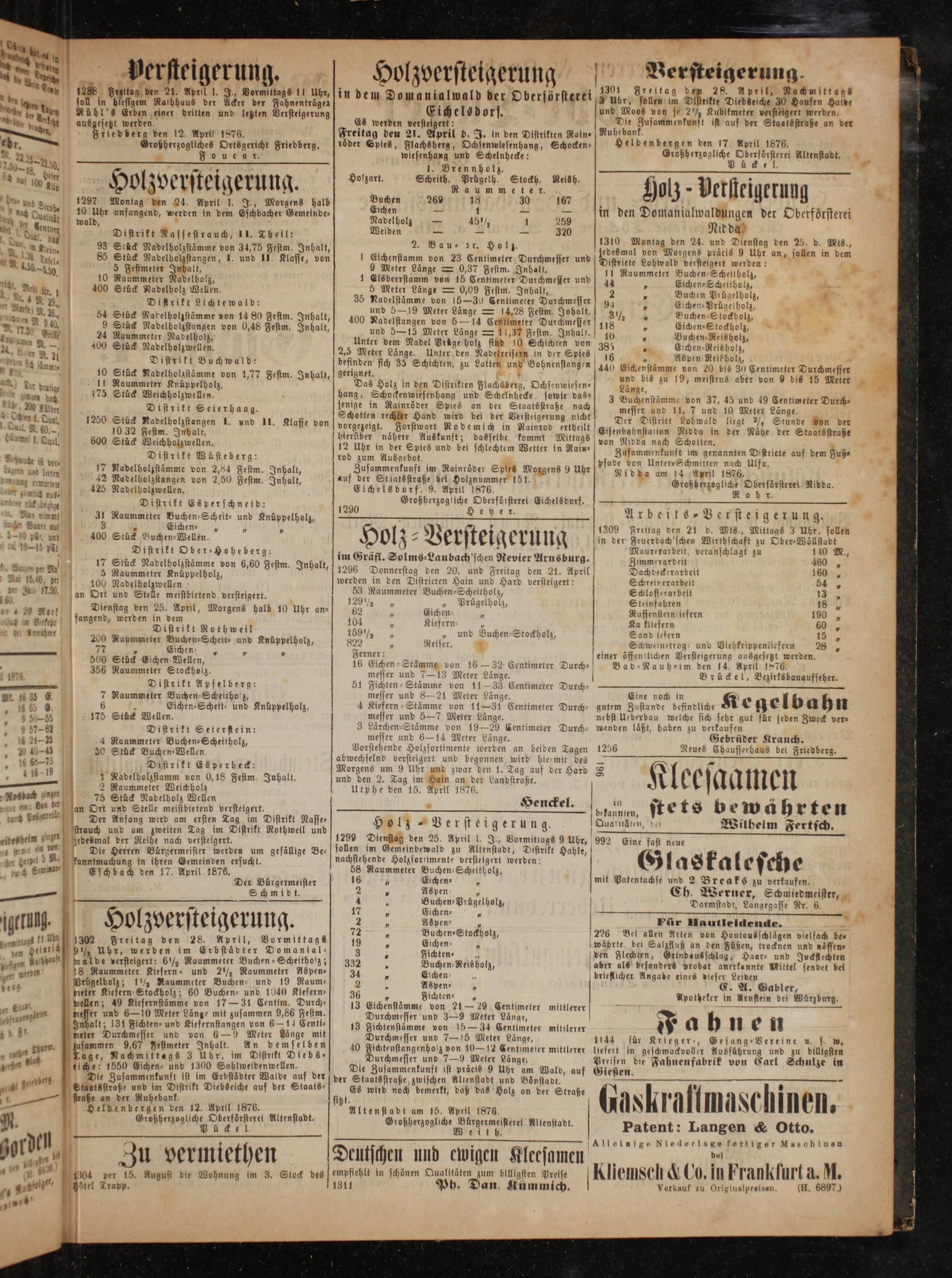1* 10 den Die Herren Bürgermeister werden um gefällige Be— 4 bete N. kanntmachung in ihren Gemeinden ersucht. 6 Stminat Eschbach den 17. April 1876. Der Bürgermeister — Schmidt. tlg. Holzversteigerung. ade l. 1302 Freitag den 28. April, Vormittags