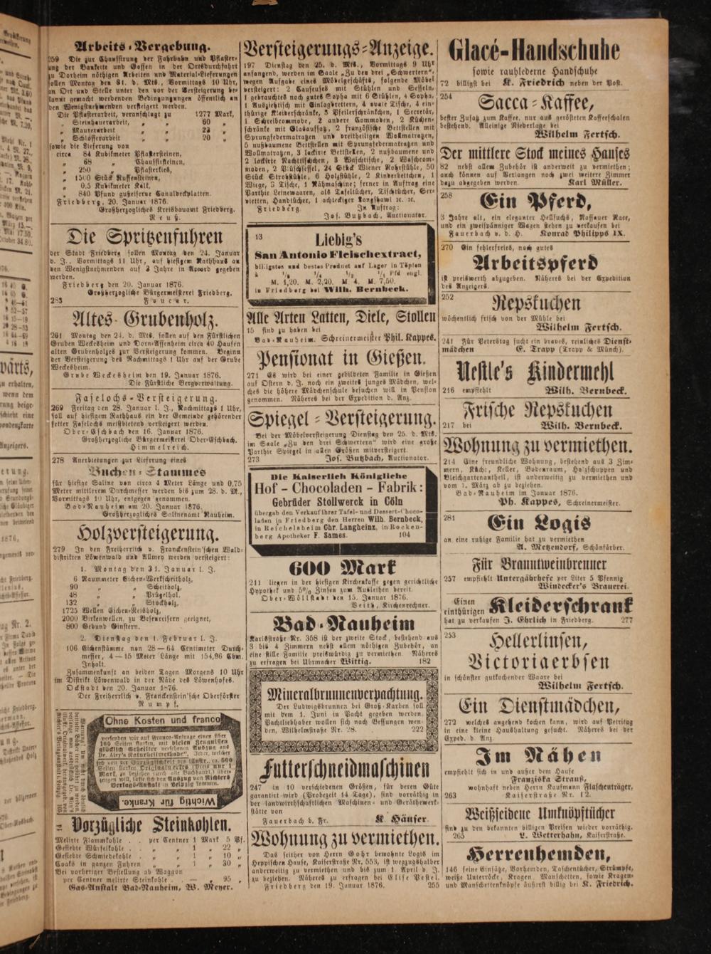 0,5 Kubikmeter Kalk, „ 8840 Pfund gußeiserne Canaldeckplatten. Friedberg, 20. Januar 1876. Großherzogliches Kreisbauamt Friedberg. Reuß.