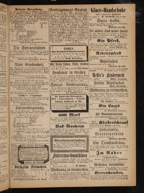 Gruben Weckesheim und Dorn-Assenheim eirca 40 Haufen alten Grubenholzes zur Versteigerung kommen. Beginn der Versteigerung des Nachmittags 1 Uhr auf der Grube Weckesheim. 7 Grube Weckesheim den 19. Januar 1876. Die Fürstliche Bergverwaltung.