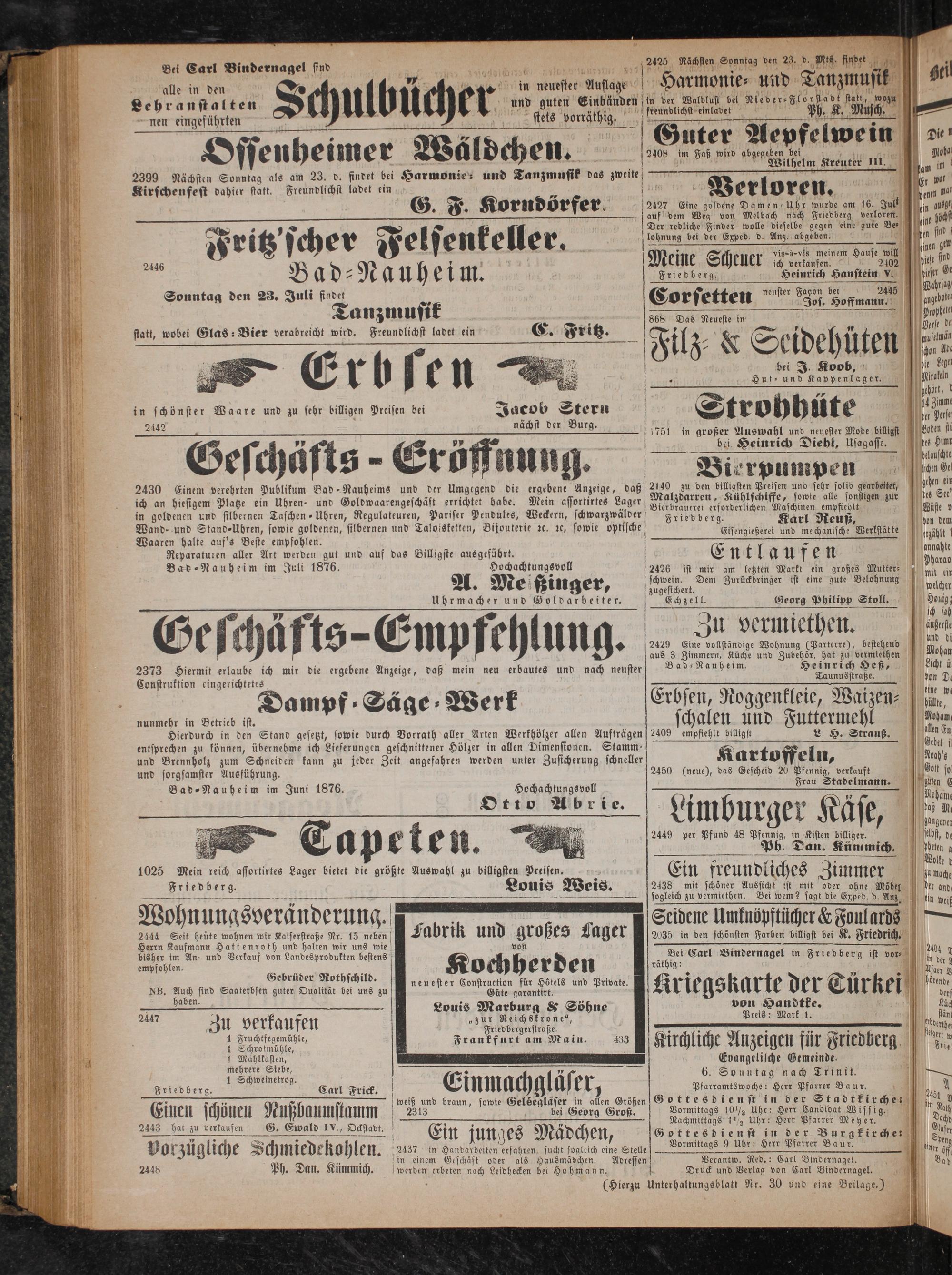 Druck und Verlag von Carl Bindernagel. Unterhaltungsblatt Nr. 30 und eine Beilage.)